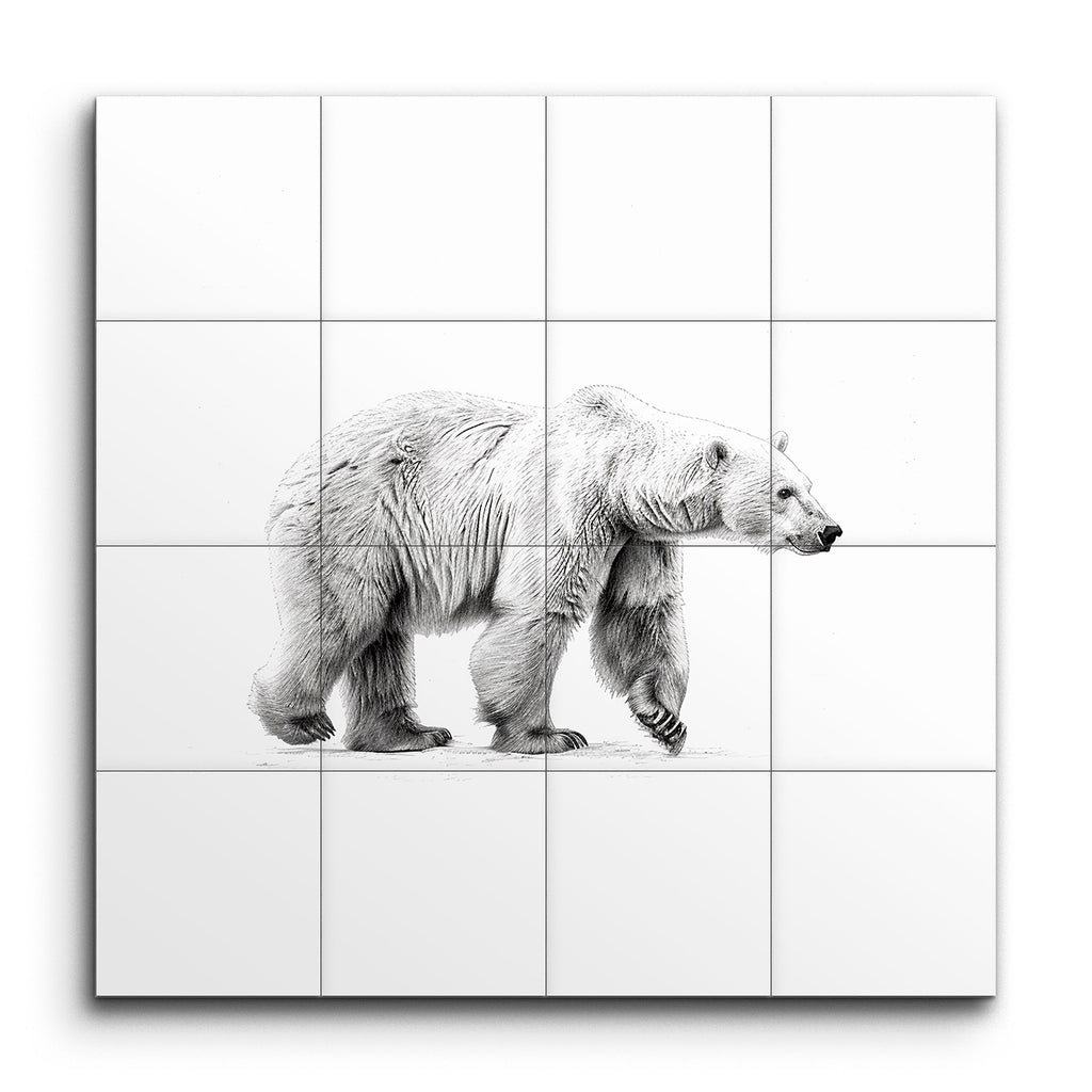 Immerse yourself in the majestic beauty of nature with this stunning tile mural featuring a hyperrealistic polar bear. Every detail of the bear's thick, textured fur is meticulously rendered, capturing a lifelike sense of movement and purpose as it strides gracefully in side profile. The subtle use of shading and light adds depth without distraction, drawing your focus entirely to this magnificent creature. This artwork is a testament to the intricate beauty of wildlife, perfect for adding a touch of nature to any space.