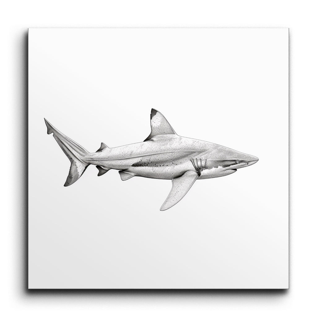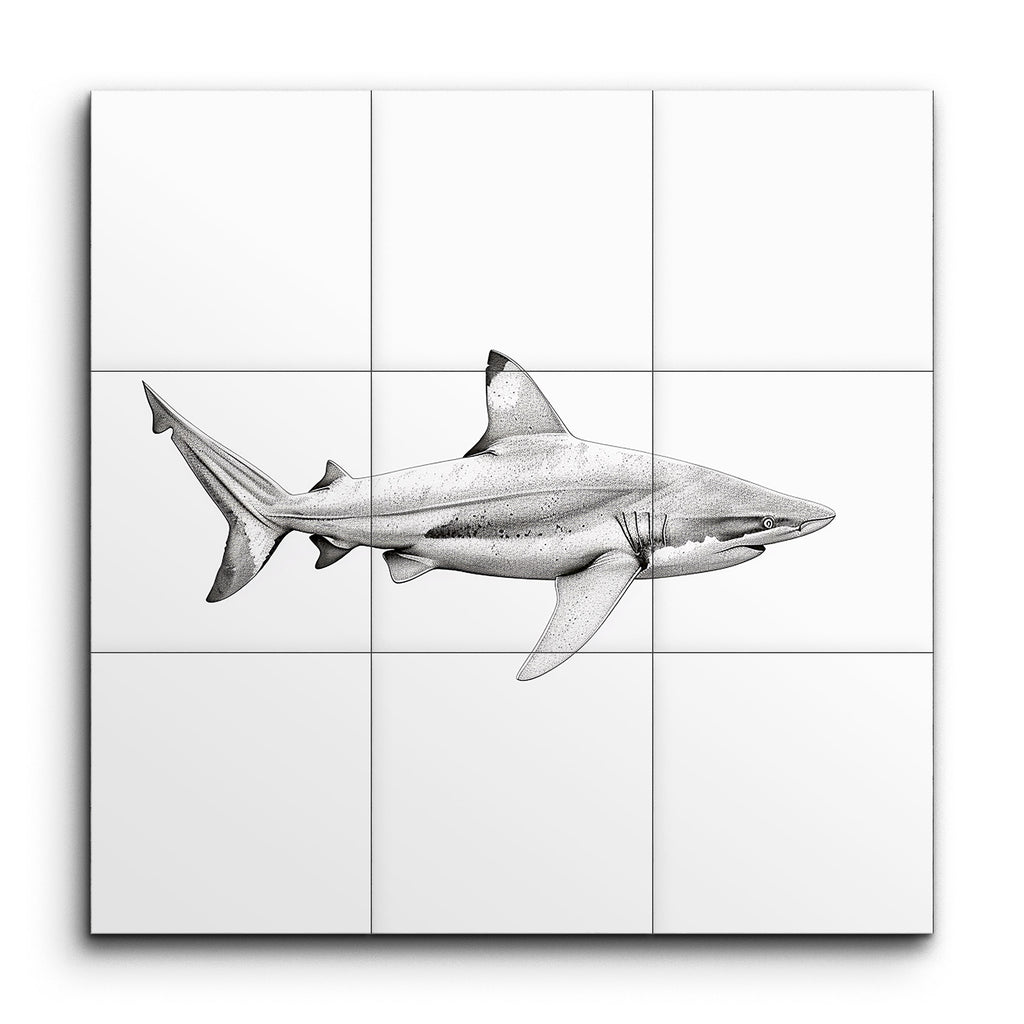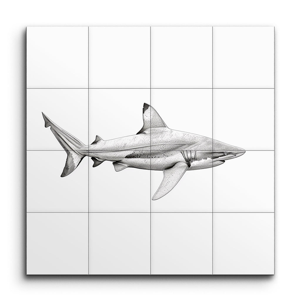 Dive into the mesmerizing depths of marine life with our stunning tile mural featuring a highly realistic illustration of a shark. This artwork captures the majestic predator in meticulous detail, showcasing its streamlined body, prominent dorsal fin, and sharp snout in a captivating side profile. The monochromatic shades of gray, combined with masterful shading and highlights, create a three-dimensional effect that brings the shark to life. Every gill, fin, and subtle texture of the shark's skin is intricately rendered, celebrating the natural grace and power of this awe-inspiring creature. Perfect for adding a touch of oceanic elegance to any space.