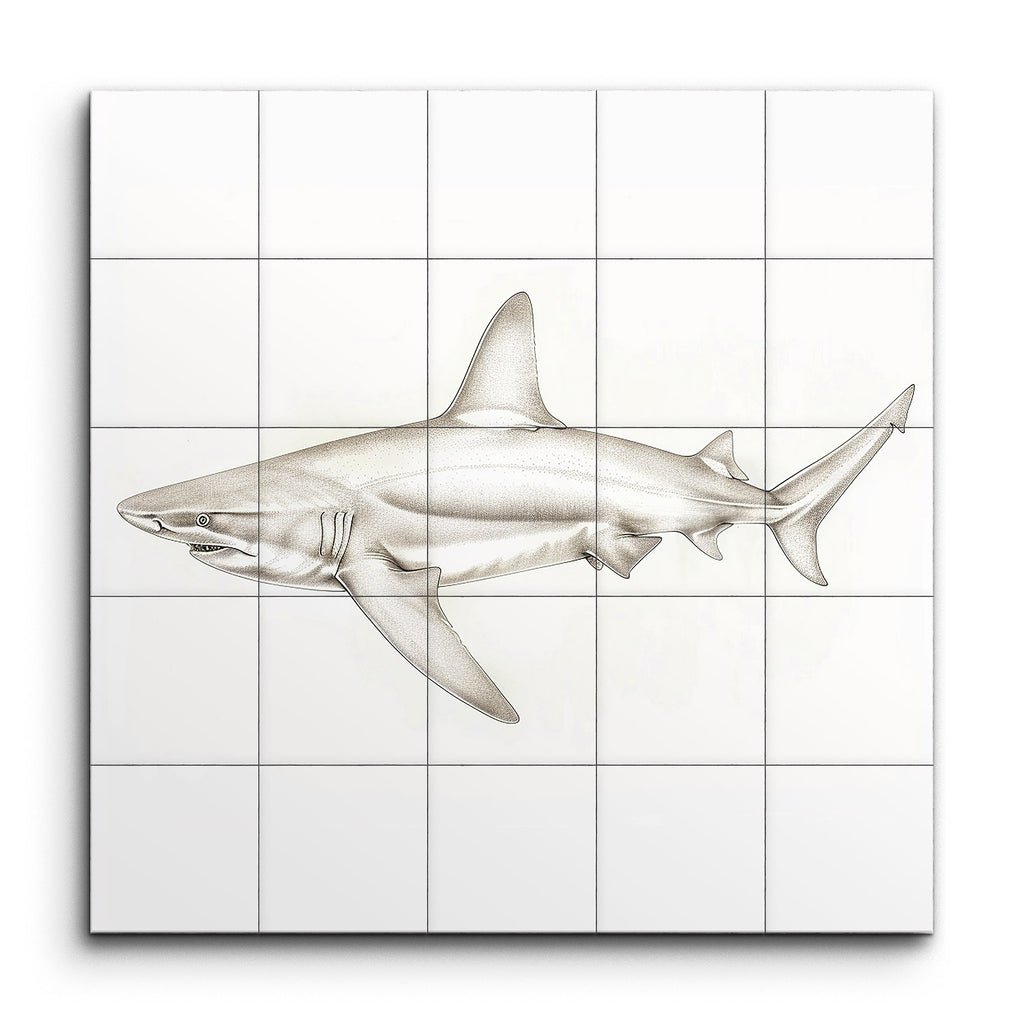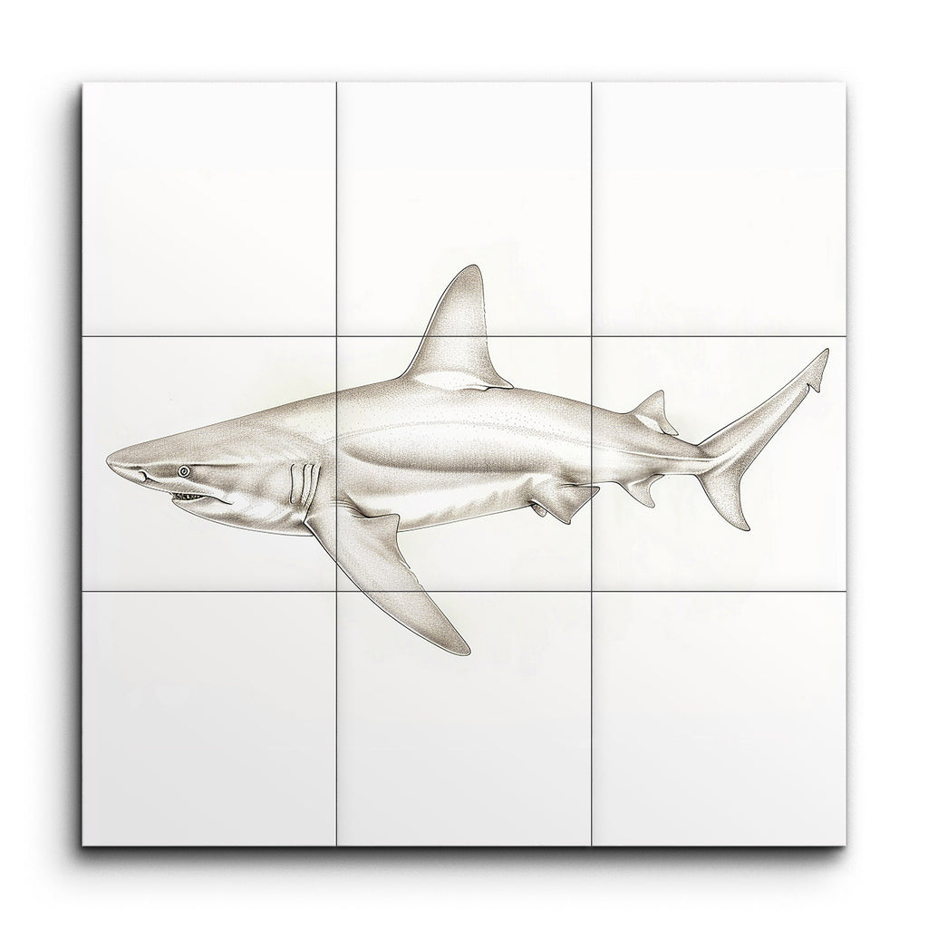 Immerse yourself in the captivating world of marine life with this stunning tile mural, featuring a meticulously detailed illustration of a shark. The artwork presents the shark in a side profile, showcasing its streamlined body, prominent dorsal fin, and powerful tail with astonishing realism. Subtle shades of gray and white bring the shark to life, while fine lines and delicate shading emphasize its anatomical features, from the textured skin to the expressive eyes and gills. Perfect for those who appreciate scientific accuracy and natural beauty, this mural transforms any space into an elegant homage to the majesty of the ocean's apex predator.