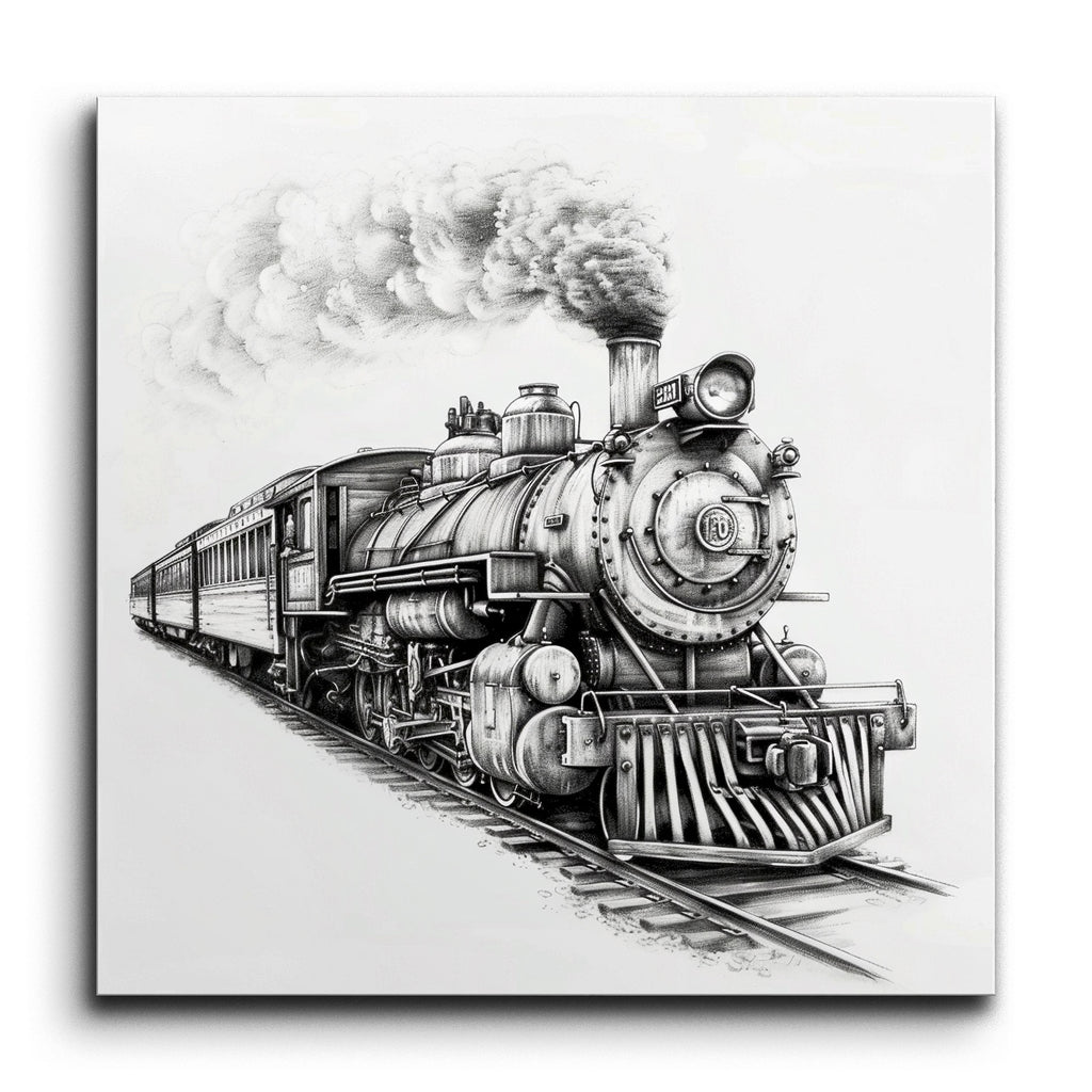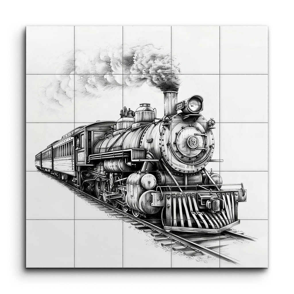Experience the majesty of early 20th-century rail travel with this stunning tile mural, featuring a vintage steam locomotive in exquisite detail. The artist masterfully captures the intricate components and mechanical parts, from the large circular headlight to the billowing smoke from the prominent smokestack. Rendered in a realistic style with meticulous shading and line work, this mural brings to life the dynamic movement and timeless charm of a bygone era, perfect for any train enthusiast or lover of classic art.