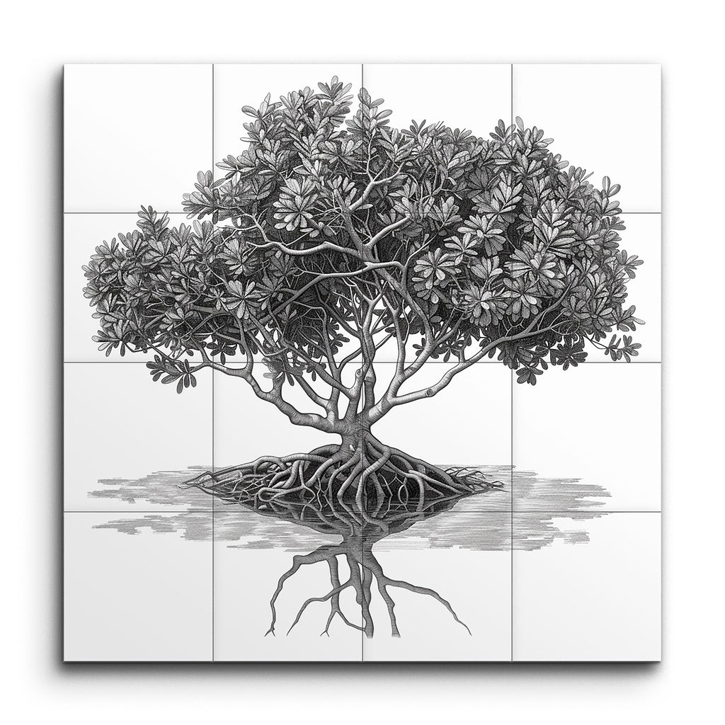 Experience the serene beauty of nature with this monochromatic tile mural, featuring a meticulously detailed illustration of a majestic tree. Its intricate root system extends into a reflective water surface, creating a mesmerizing symmetry. The lush, textured canopy and twisted, interwoven branches add depth and complexity, while the masterful shading and line work bring the tree to life with a striking three-dimensional quality. This artwork captures the essence of natural growth in a serene yet dynamic display.