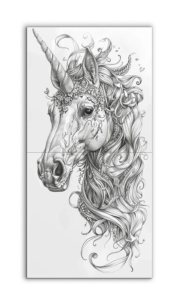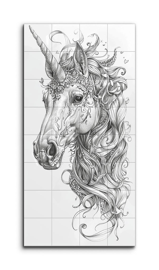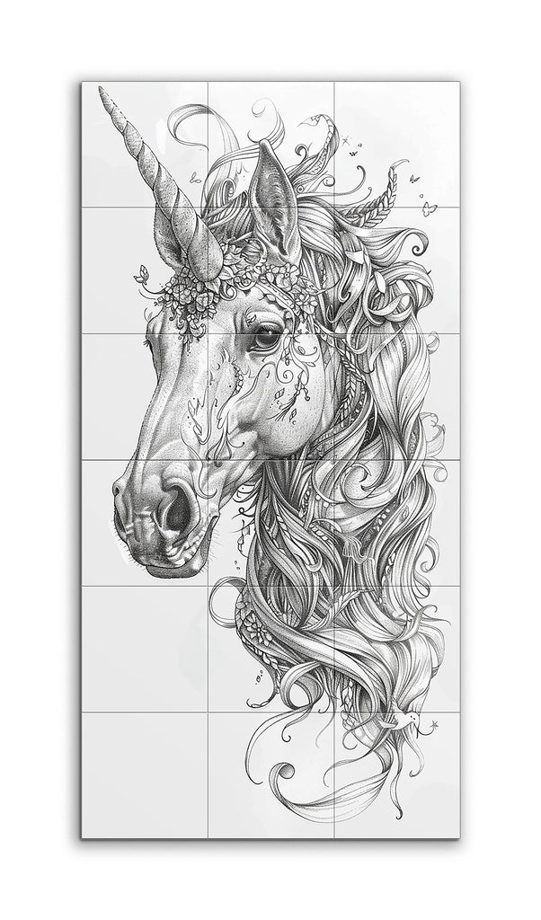 This tile mural showcases a highly detailed black and white illustration of a unicorn's head. The unicorn, with its long, spiraled horn adorned with intricate decorations, exudes a sense of majesty and grace. Its flowing mane, depicted in waves and curls, is intricately detailed, giving it a dynamic and lifelike appearance. The unicorn's serene expression and expressive eyes convey wisdom and gentleness. Meticulous shading and fine line work create depth and texture, enhancing the artwork's delicate and ethereal quality.