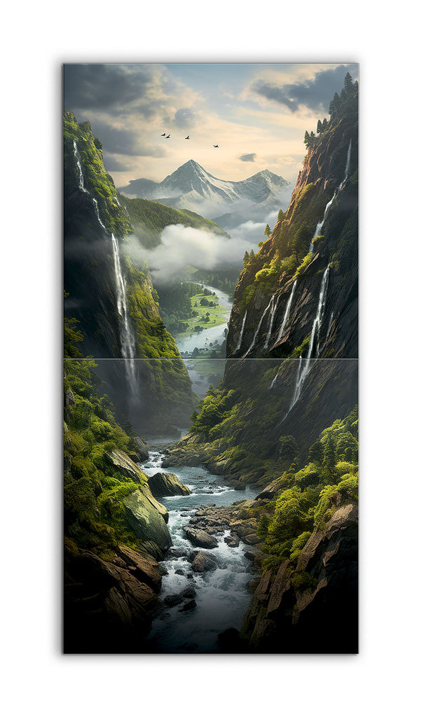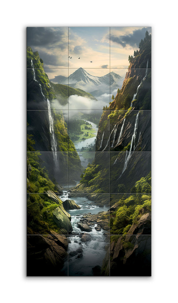 This tile mural captures a breathtaking landscape with intricate detail. A dramatic valley framed by towering, rocky cliffs lush with greenery features multiple cascading waterfalls. A winding river flows through the rocky terrain, guiding the eye to a distant horizon. Majestic snow-capped mountains rise above mist and clouds, adding depth and grandeur. Soft hues of blue and orange suggest dawn or dusk, with birds soaring in the sky, bringing life to this tranquil, highly realistic scene.