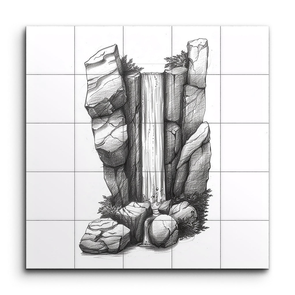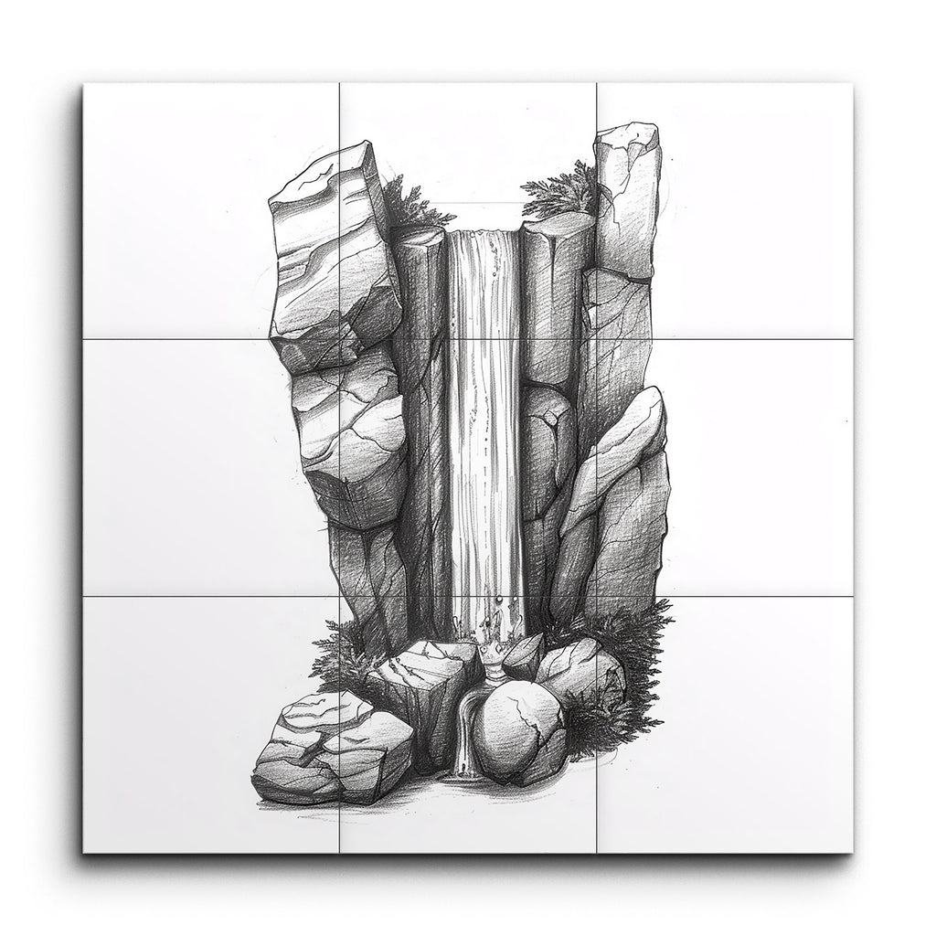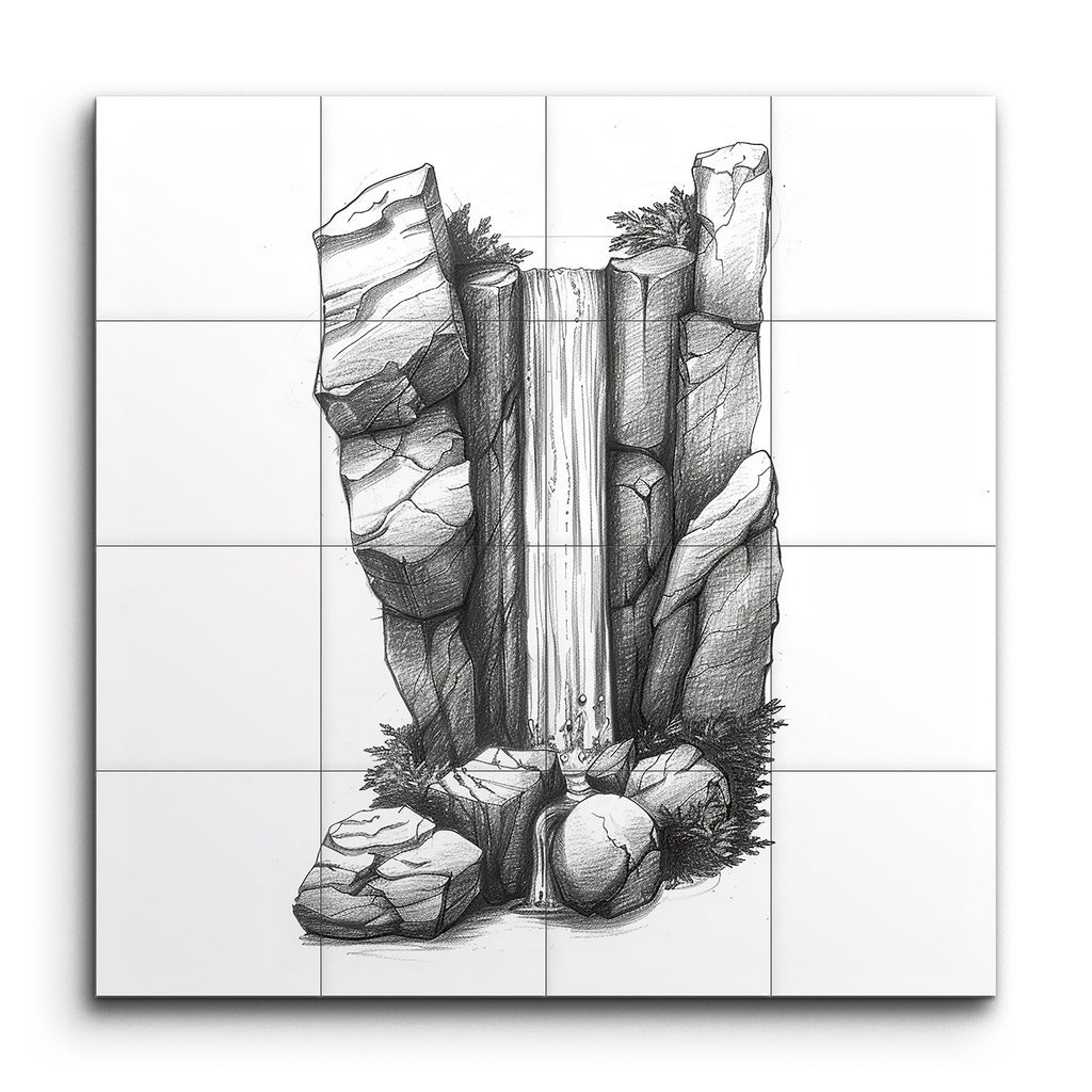 Transform your space with this captivating tile mural, showcasing a meticulously detailed black and white illustration of a majestic waterfall. The cascading water flows elegantly between rugged rock formations, rendered with precise cross-hatching and shading that bring out their textured, three-dimensional appearance. The intricate line work and careful attention to detail evoke the timeless beauty of traditional pen and ink drawings, creating a harmonious balance of movement and stability.