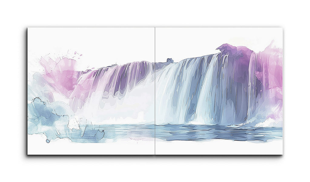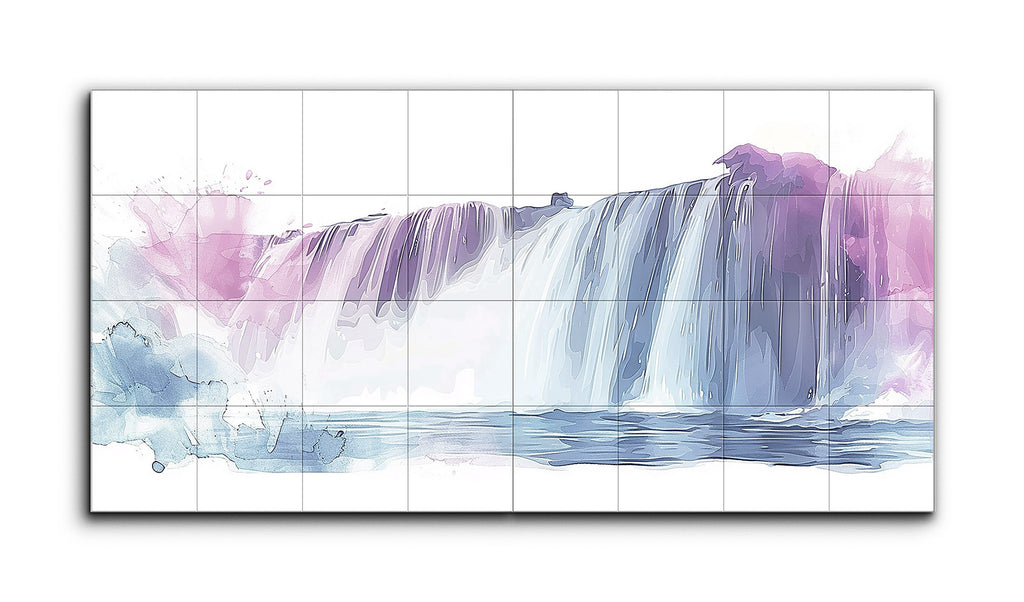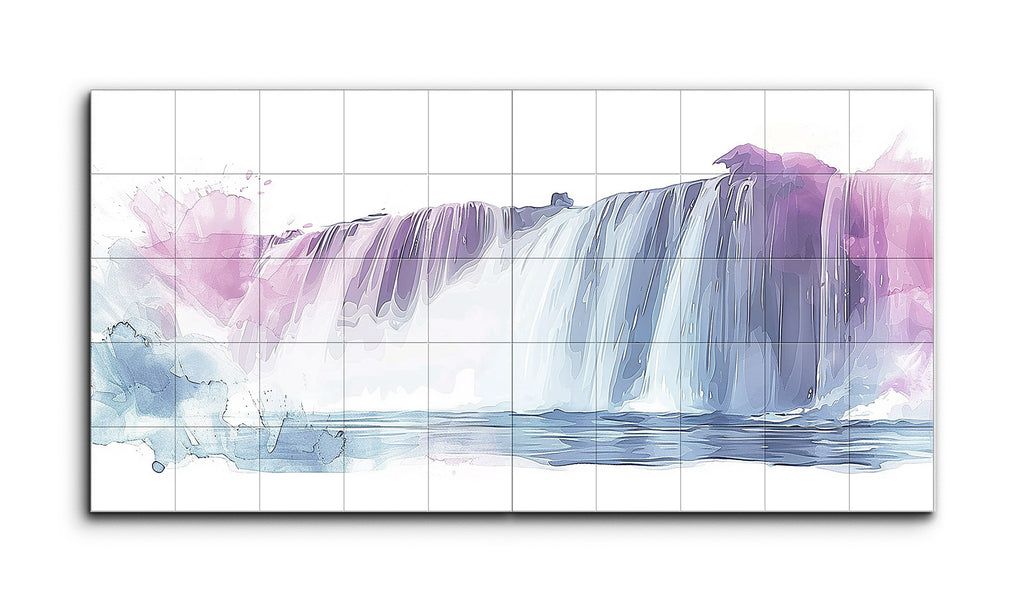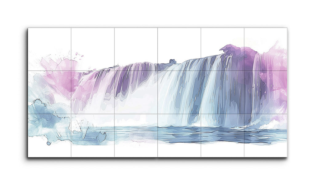 This tile mural features a majestic waterfall cascading into a serene body of water. The artwork blends realism and abstract styles, using a watercolor-like technique to emphasize fluidity and movement. Soft, flowing lines capture the dynamic motion of the waterfall, with shades of blue and purple creating depth and dimension. The minimalistic background highlights the luminous waterfall, while subtle light and shadow effects add to its serene yet powerful presence. This visually striking piece evokes both tranquility and energy.