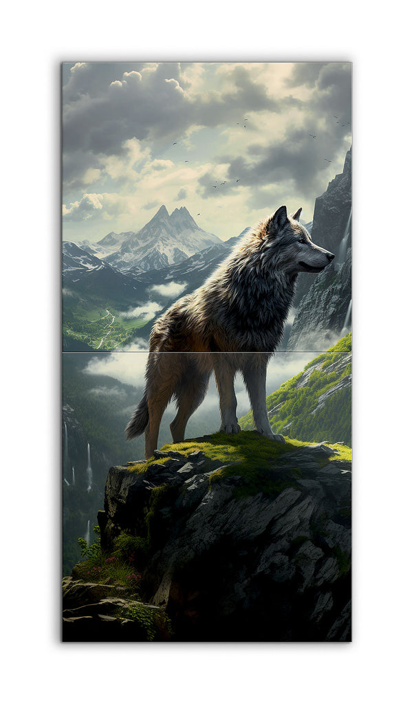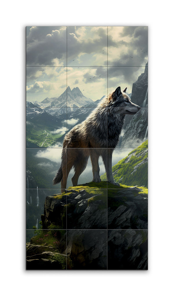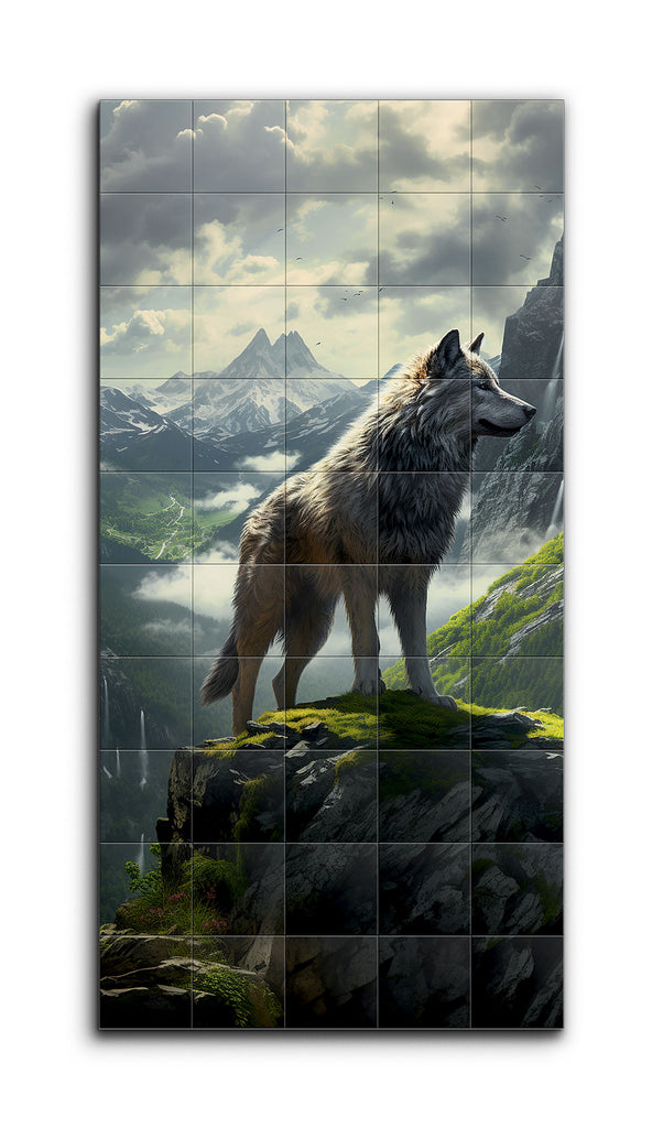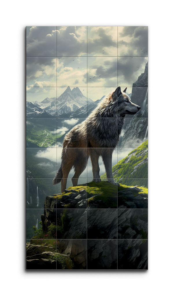 This tile mural showcases a majestic wolf standing on a rocky outcrop, gazing into the distance. The wolf's fur, rendered in grey, white, and brown, is incredibly detailed, conveying lifelike texture and depth. The background features a breathtaking mountainous landscape with snow-capped peaks and dynamic clouds, suggesting a dramatic atmosphere. Light filtering through the clouds casts a natural glow, highlighting the contours of the mountains and the wolf's fur, creating a highly realistic and immersive scene.