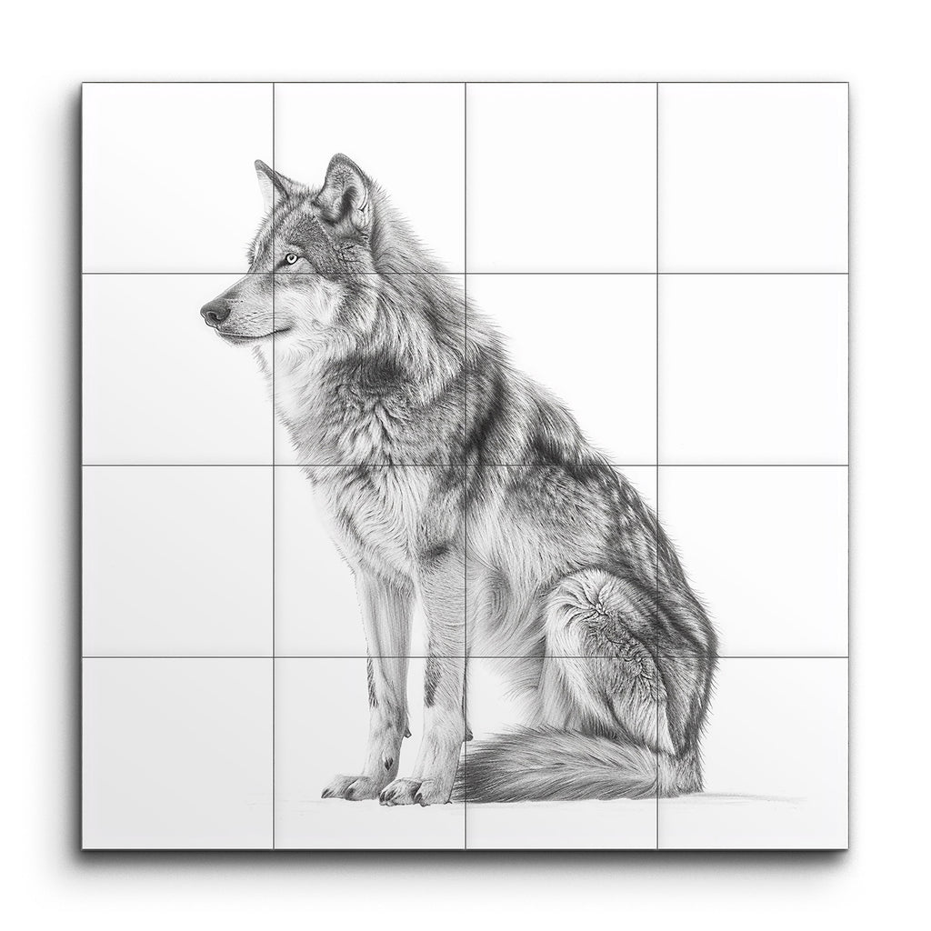 Transform your space with this captivating tile mural featuring a highly detailed pencil drawing of a wolf. The seated wolf, facing left, boasts meticulously rendered fur that varies in texture and density, from the dense, fluffy neck and chest to the more streamlined body. Its expressive eyes, focused on a distant point, add depth and emotion. The artist's fine lines and shading techniques create a lifelike, three-dimensional appearance, making this mural a stunning focal point in any room.