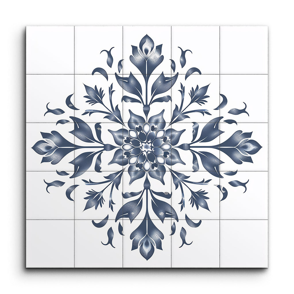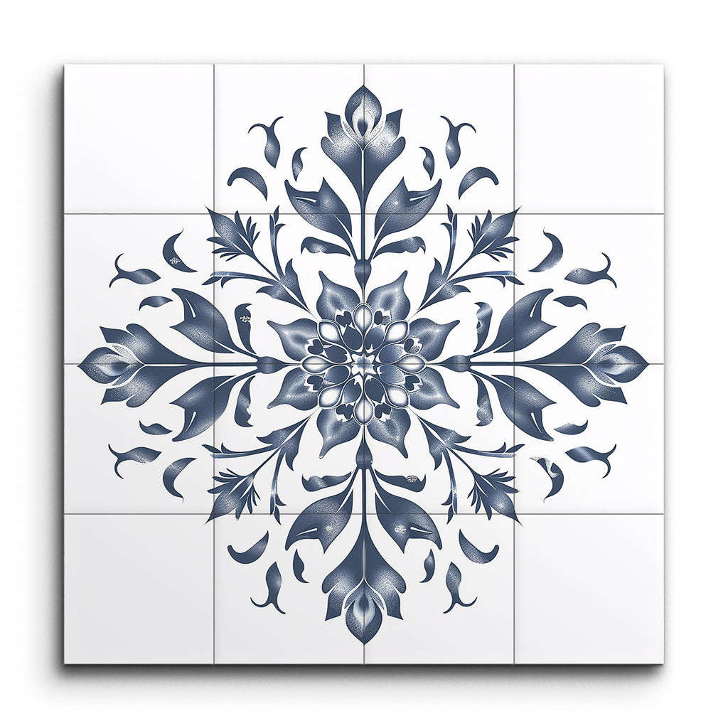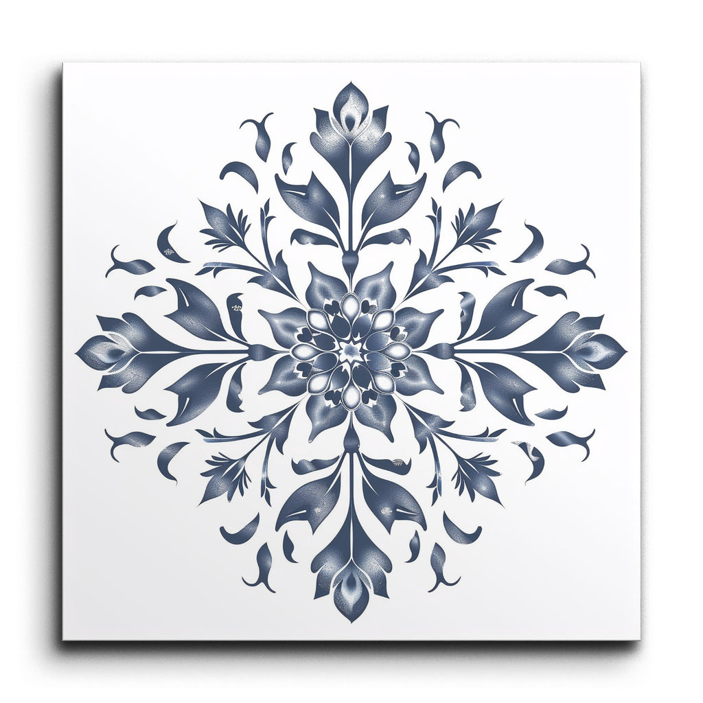 Transform your space with this stunning tile mural, featuring an intricate mandala-inspired design. The central cluster of petal-like shapes radiates outward, surrounded by layers of stylized leaves and floral elements. The cool shades of blue and gray create an elegant, three-dimensional appearance. With its ornate, symmetrical patterns and modern aesthetic, this mural adds a touch of sophistication and harmony to any environment.