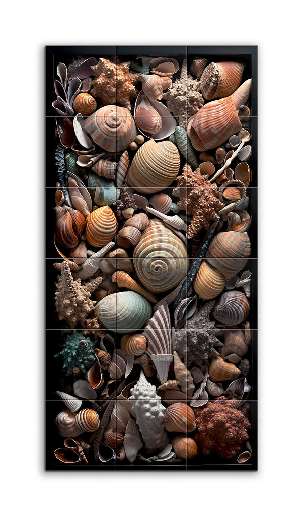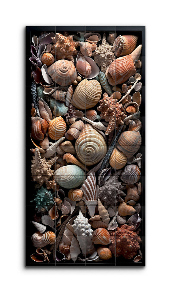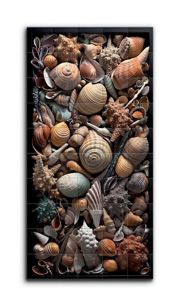 This tile mural showcases an intricately detailed and lifelike assortment of seashells and marine life. The densely packed composition features a variety of shells, corals, and oceanic elements, rendered in earthy tones of brown, beige, and cream, with touches of muted greens and blues. The shells range from smooth spirals to rugged textures, all illuminated by subtle lighting that enhances their three-dimensional quality. The hyper-realistic style captures the natural beauty and depth of marine life, inviting close inspection of its rich details.