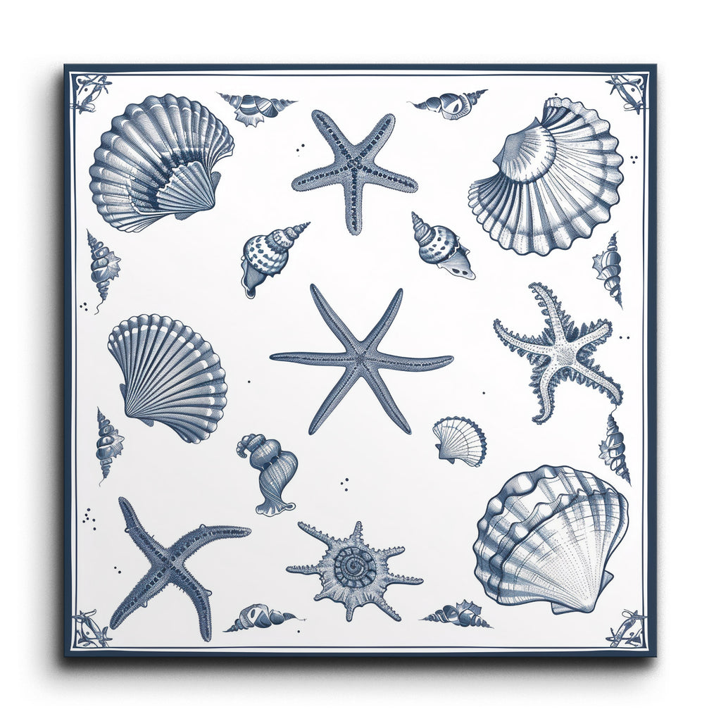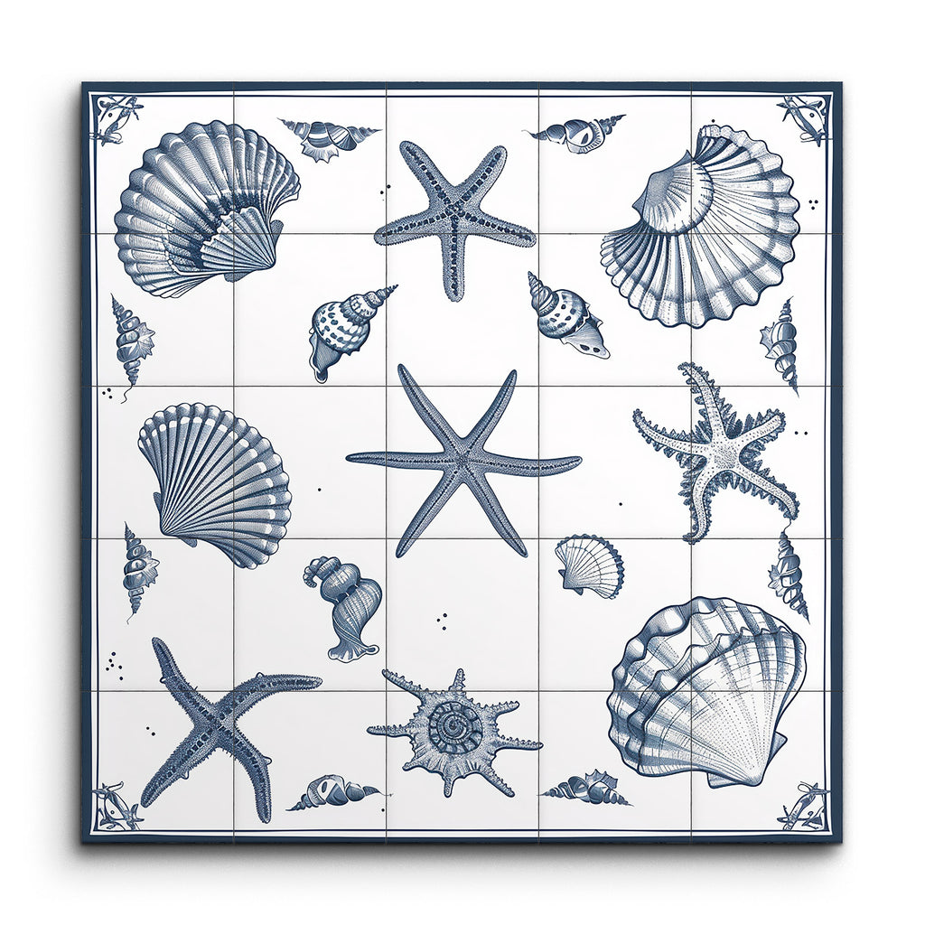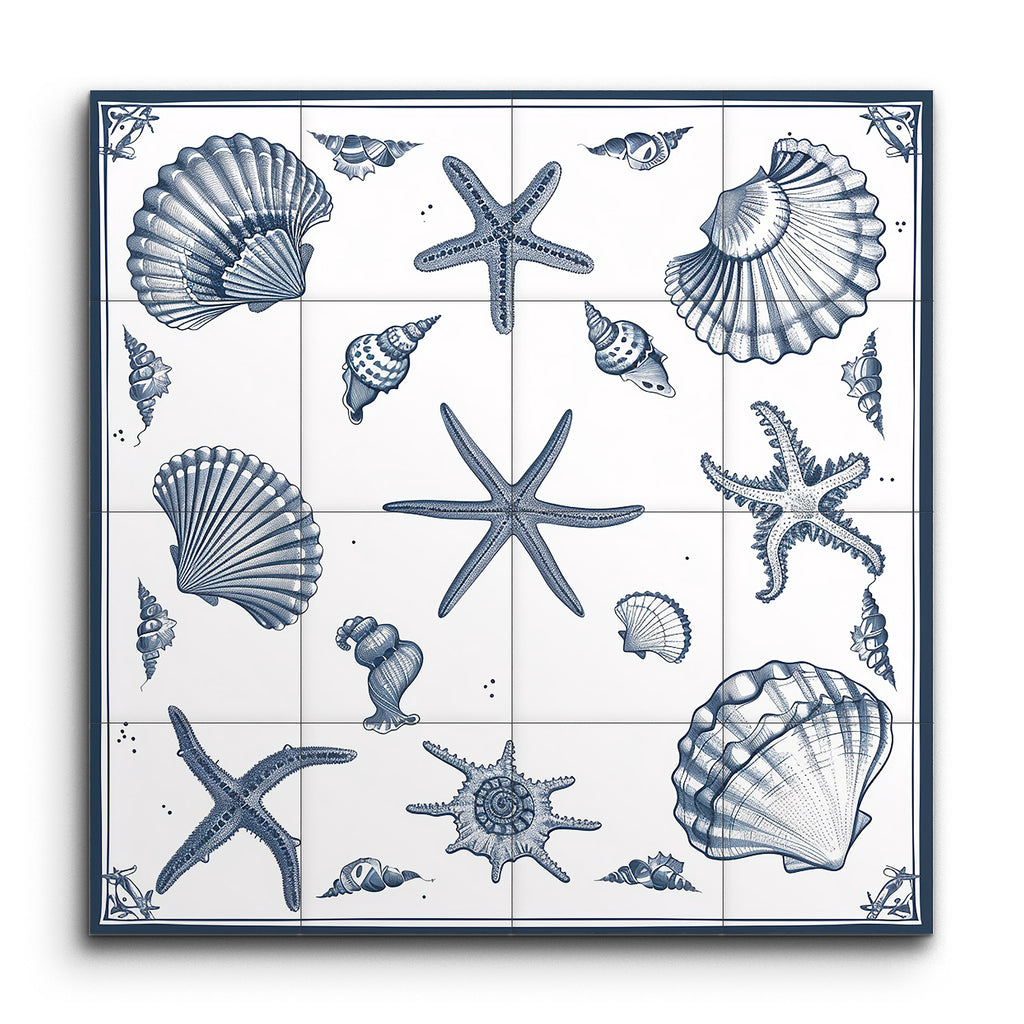 Transform your space with this exquisite tile mural, showcasing a meticulously detailed illustration of marine life. A central starfish anchors the composition, surrounded by an array of smaller starfish and seashells, all rendered in a harmonious monochromatic blue. Reminiscent of traditional botanical illustrations, the artwork features intricate patterns and textures with subtle shading, creating a refined and elegant aesthetic. Perfect for adding a touch of natural beauty and timeless charm to any setting.