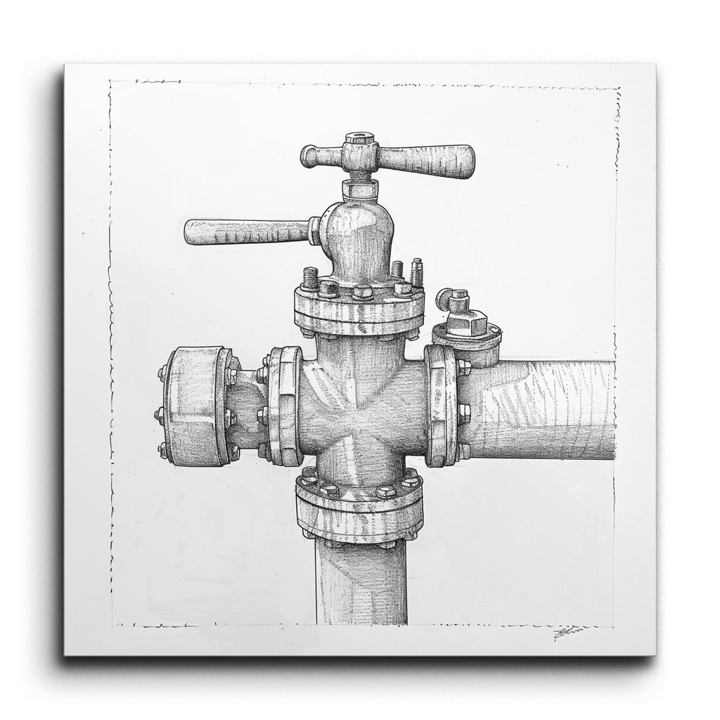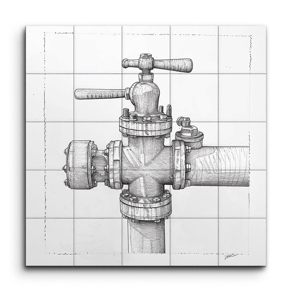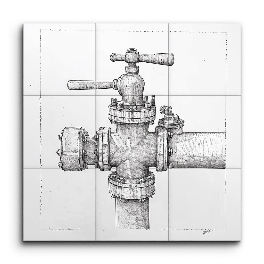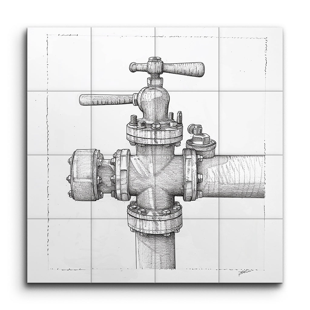 Elevate your space with this captivating tile mural, showcasing a meticulously detailed pen-and-ink illustration of a mechanical valve junction. The artwork's intricate line work brings out the texture and form of the metal components, with a T-shaped handle, circular knob, and secure bolts and nuts. The pipes, adorned with fine cross-hatching and stippling, add depth and dimensionality, reminiscent of precise engineering drawings. This mural is a testament to exceptional craftsmanship and technical artistry.
