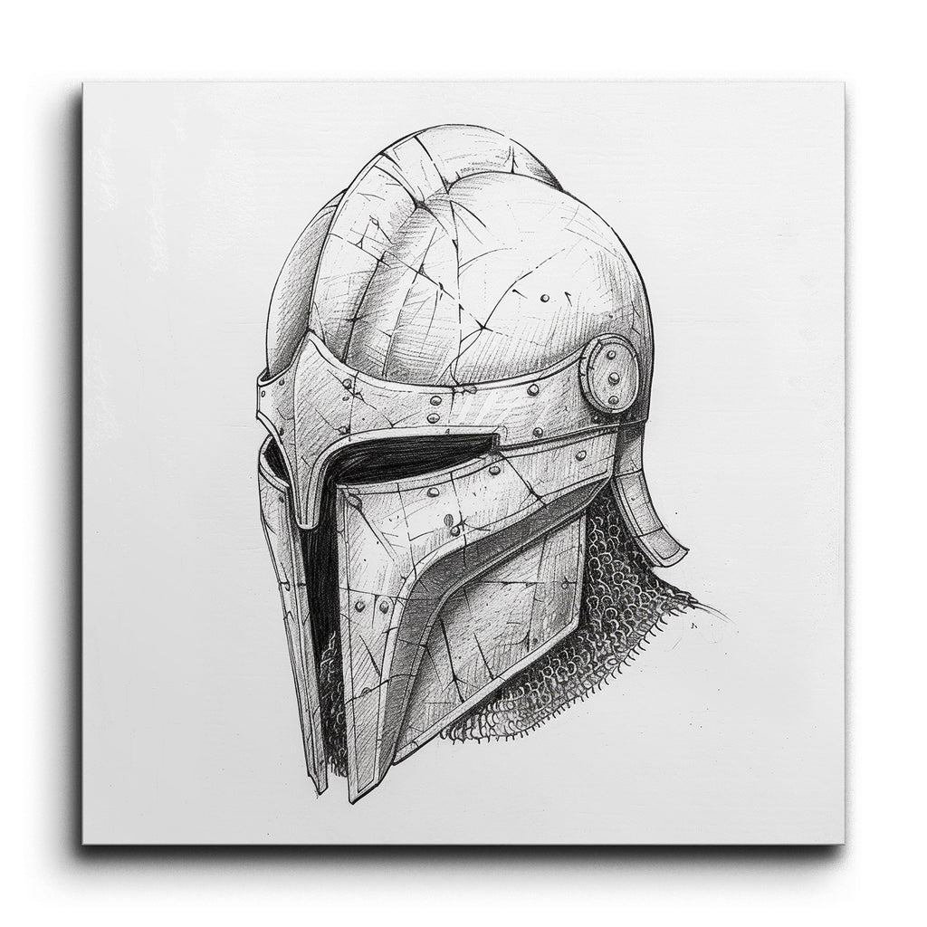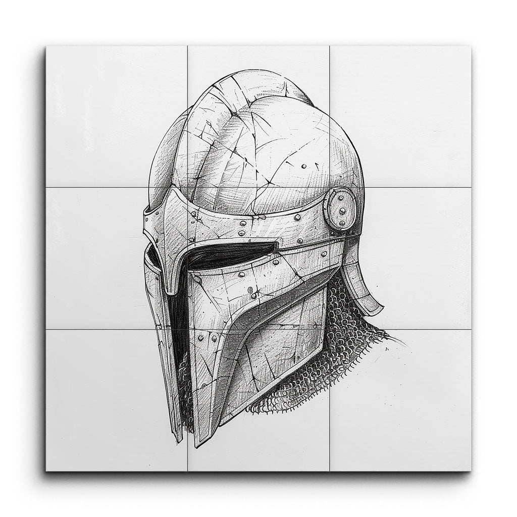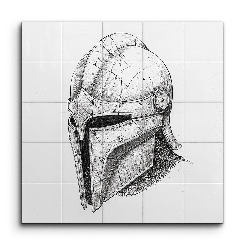 Transform your space with this captivating tile mural featuring a meticulously detailed, black and white ink drawing of a medieval helmet. The artwork showcases a rounded top with a prominent ridge, a face guard with a narrow eye slit, and intricate shading that brings out a textured, battle-worn appearance. The artist’s masterful use of cross-hatching and stippling techniques adds depth and dimension, while the realistic depiction of rivets, bolts, and chainmail evokes the essence of historical armor with dramatic precision.
