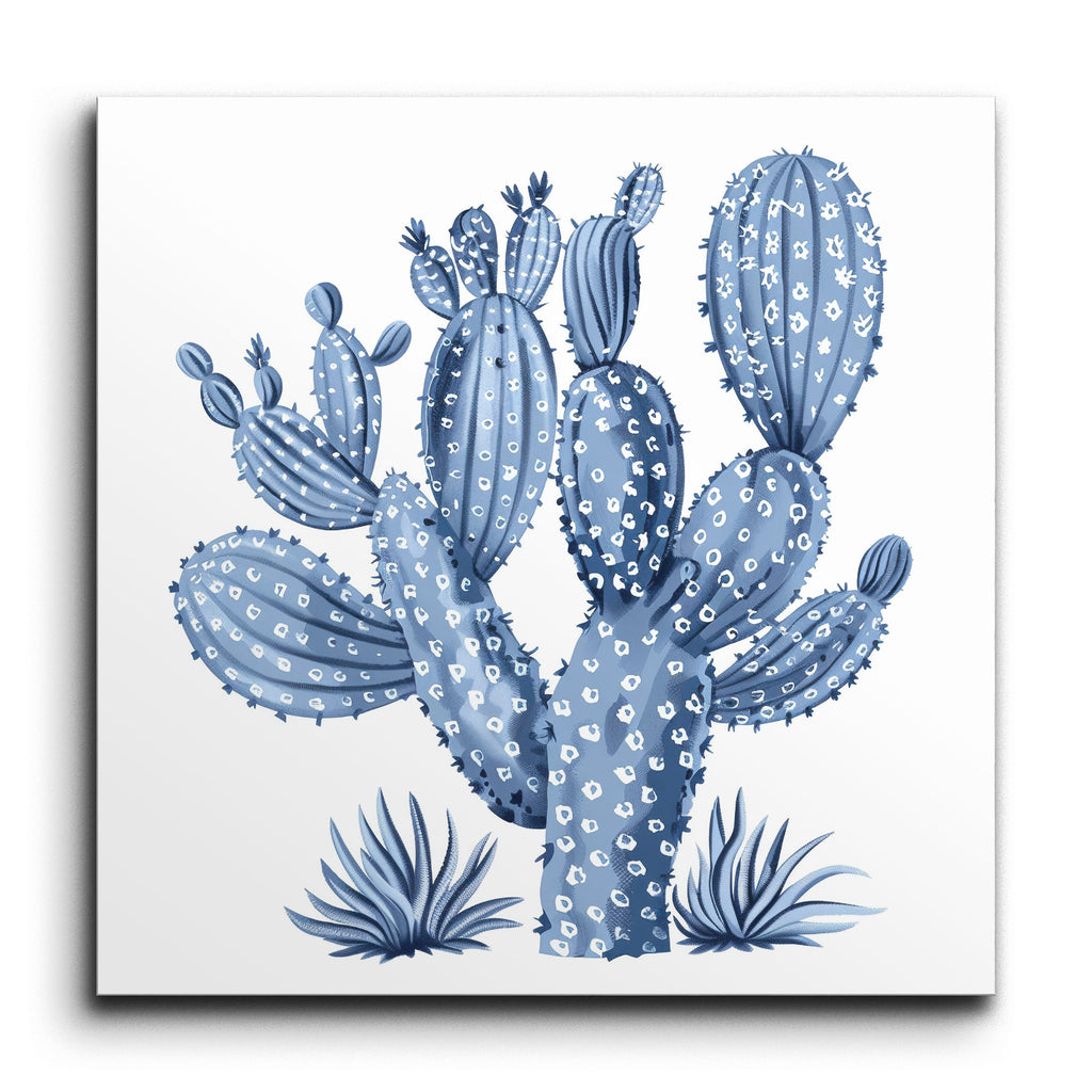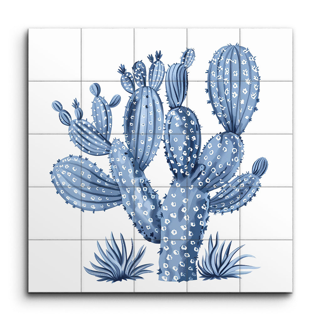 Transform your space with this captivating tile mural, featuring a stylized blue cactus that brings a touch of modern elegance to any setting. The artwork showcases a dynamic composition of elongated and cylindrical segments, each adorned with delicate white, star-like patterns. Fine lines highlight the natural ribbing of the cactus, while smaller spiky plants at the base enhance the desert theme. The monochromatic blue palette, accented with intricate detailing, creates a harmonious, serene, and visually striking piece.