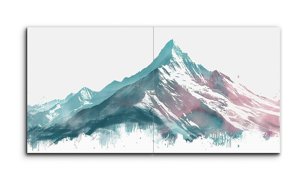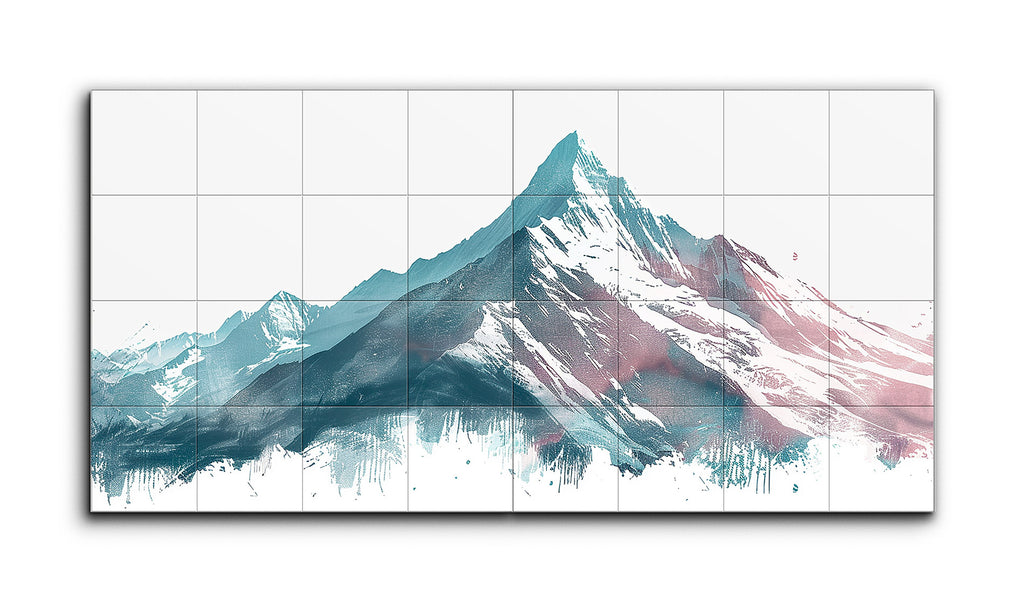 This tile mural features a modern and stylized depiction of a mountain range, split across two panels in a diptych presentation. The artwork combines abstract elements with a touch of realism, using expressive brush strokes and a limited color palette with cool tones and hints of warm colors. Sharp peaks draw the eye, while a mix of smooth and textured areas adds depth and dynamism. Unexpected splashes of pink and red offer a contemporary twist, evoking a particular time of day or enhancing the emotional atmosphere.