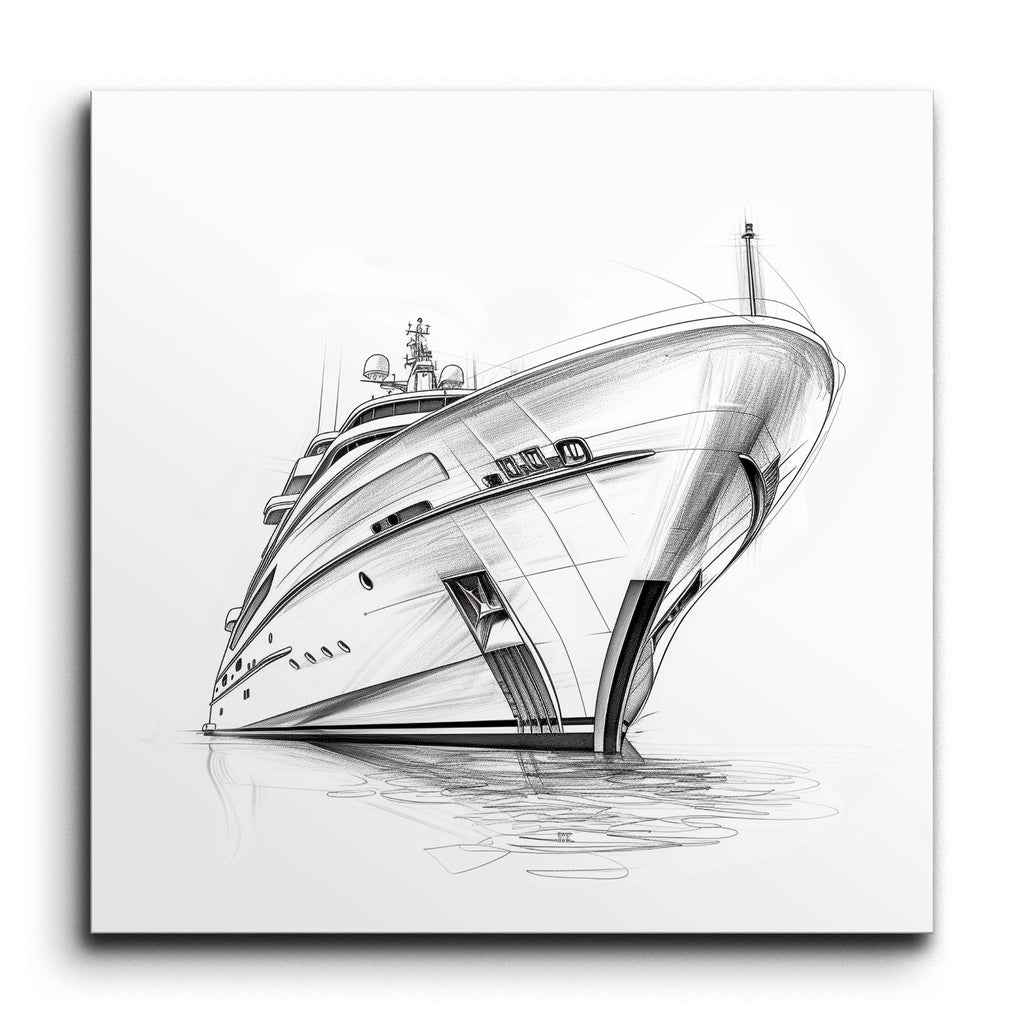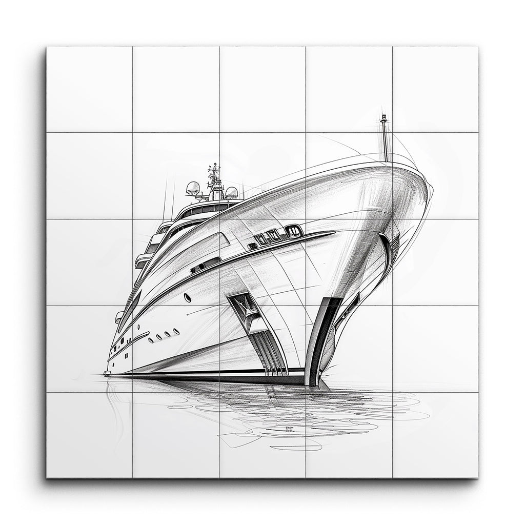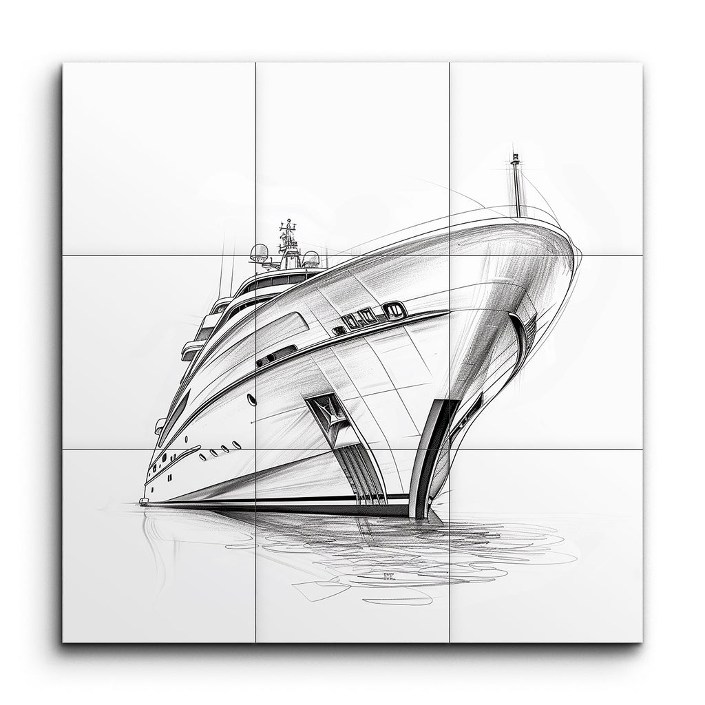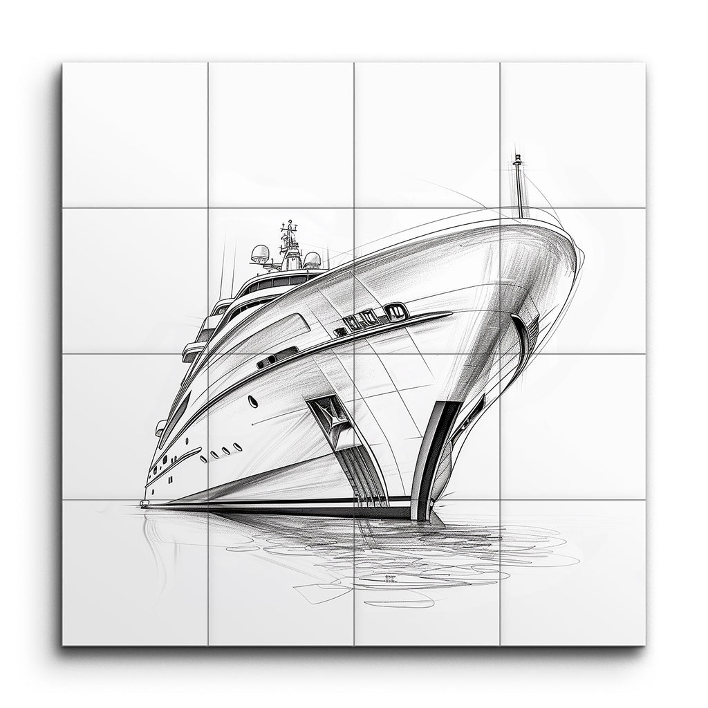 Elevate your space with this sophisticated tile mural featuring a detailed sketch of a modern yacht. Drawn from a low, front-left perspective, the artwork emphasizes the grandeur and sleek design of the vessel. Crisp lines showcase its contours, while minimal shading adds depth and dimension. Subtle, wavy lines indicate water reflections, enhancing realism. The technical, architectural style highlights the yacht’s elegance and engineering, making it a refined addition to any setting.