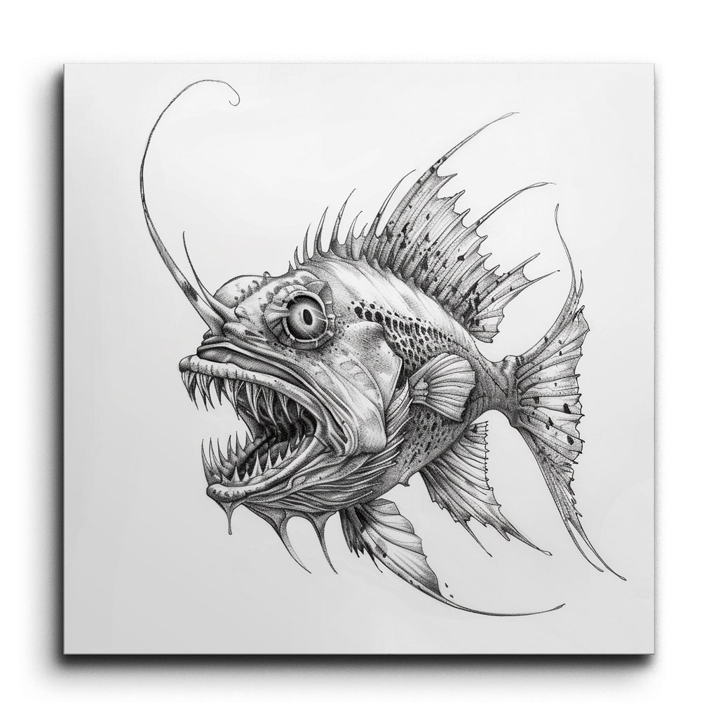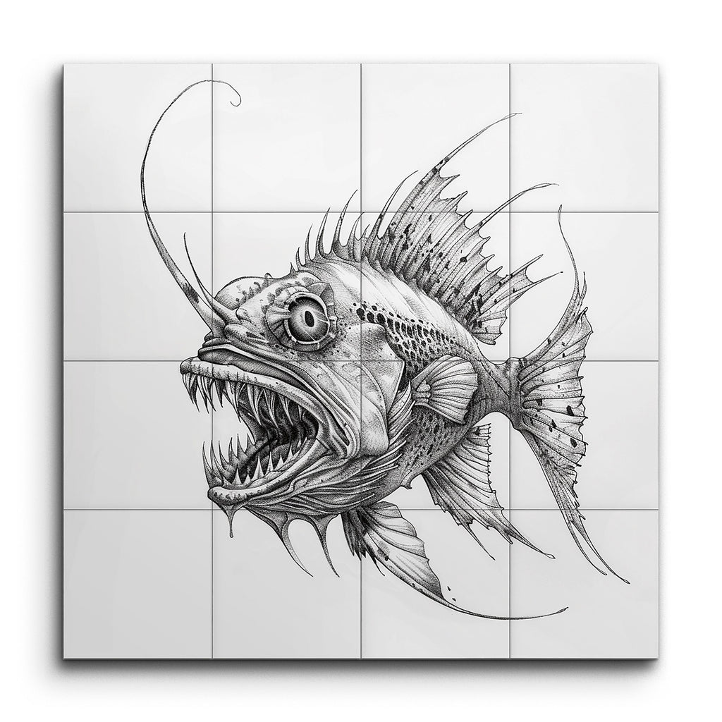 Transform your space with this captivating tile mural featuring a meticulously detailed, monochromatic fish. This fierce, fantastical creature boasts exaggerated, monstrous features, including jagged teeth, a menacing open mouth, and intricate textures of scales, ridges, and spines. Its dramatic fins and tattered tail suggest movement and battle-worn resilience. A unique appendage and intense gaze add to its otherworldly allure, while expert shading and line work create a lifelike, three-dimensional effect.