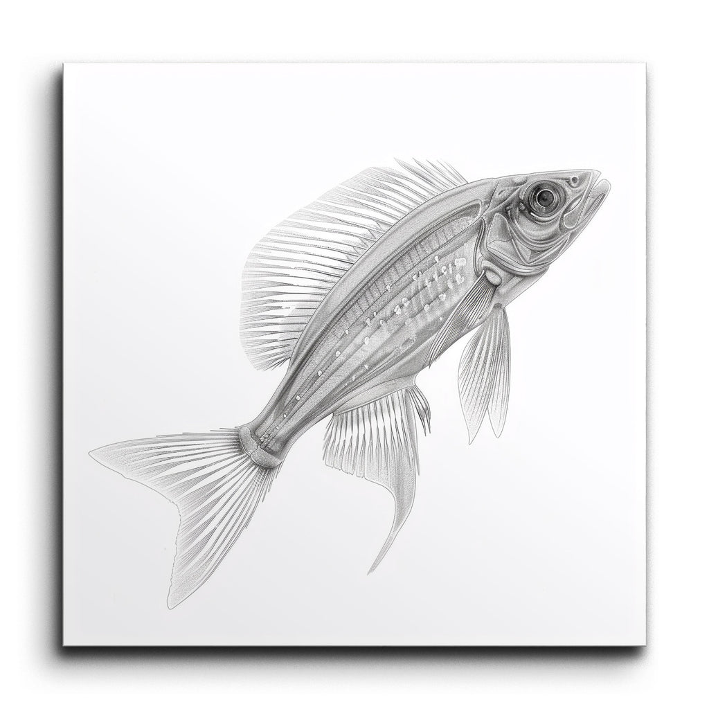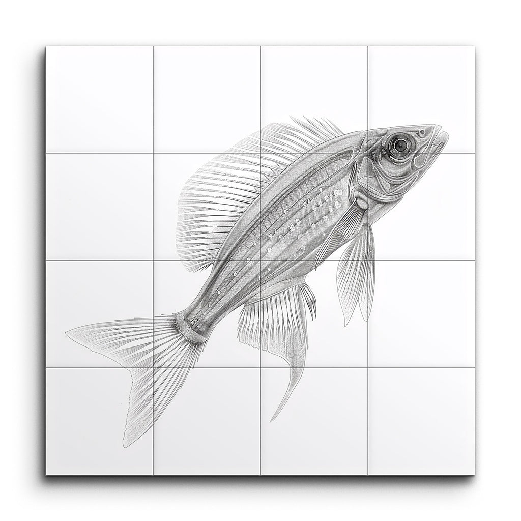 Transform your space with this captivating tile mural featuring a meticulously detailed illustration of a fish in a monochromatic, grayscale palette. This scientifically inspired artwork showcases the fish's anatomical features with exceptional clarity and precision. From the delicate lines of the fins to the subtle gradient shading of the body, each element is rendered to perfection. The lifelike eye and textured scales add a touch of realism, making this mural both informative and visually stunning.
