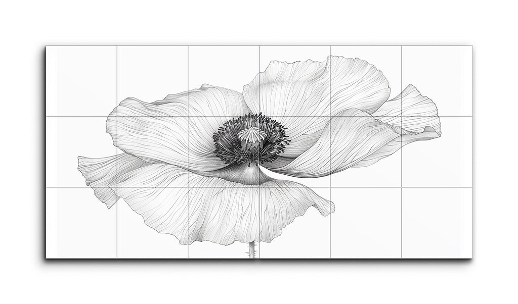 This tile mural features a monochromatic line art depiction of a large, detailed flower, likely a poppy. The petals are rendered with delicate, flowing lines that capture the soft, translucent texture of the flower. The center is intricately detailed, with numerous stamens and anthers creating depth and contrast against the lighter petals. The slender stem and attached leaf are drawn with a lighter touch, emphasizing the overall delicacy. The artwork showcases natural beauty through precise and controlled line work.