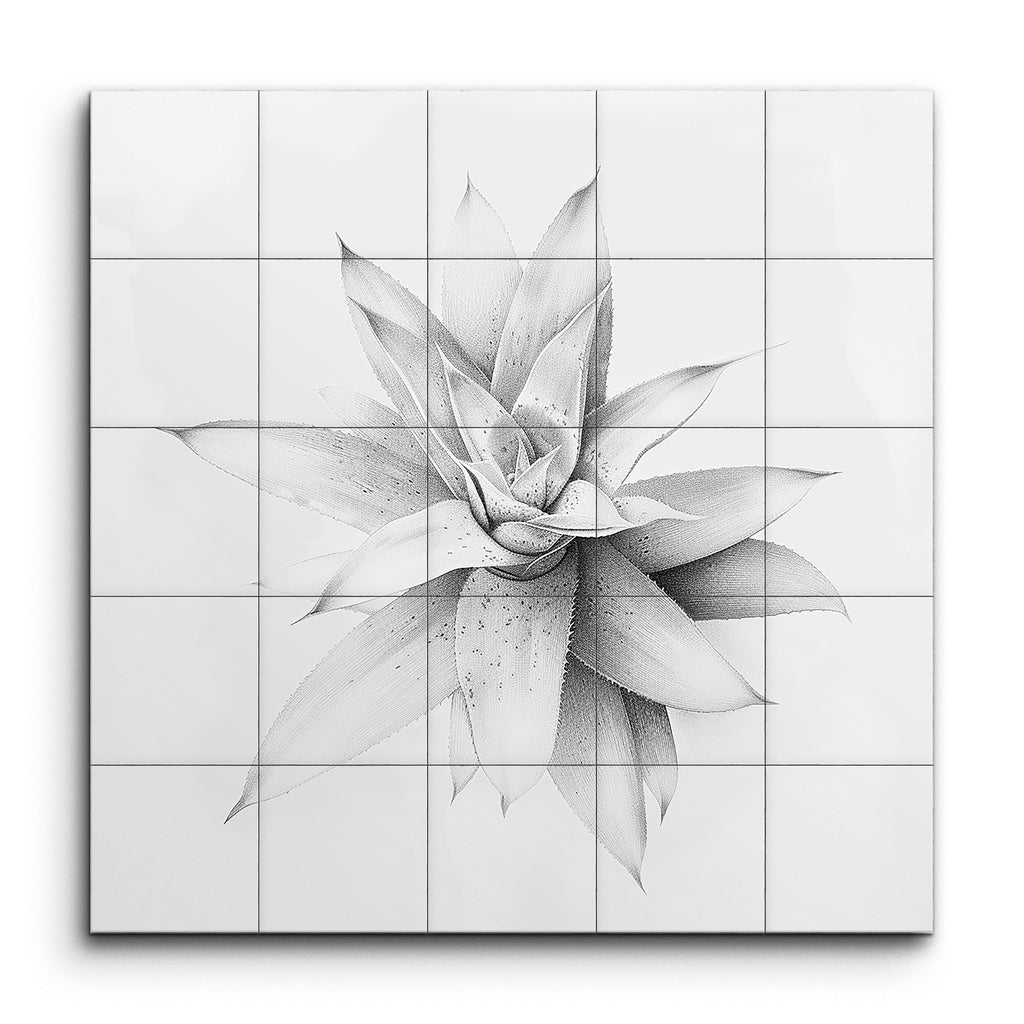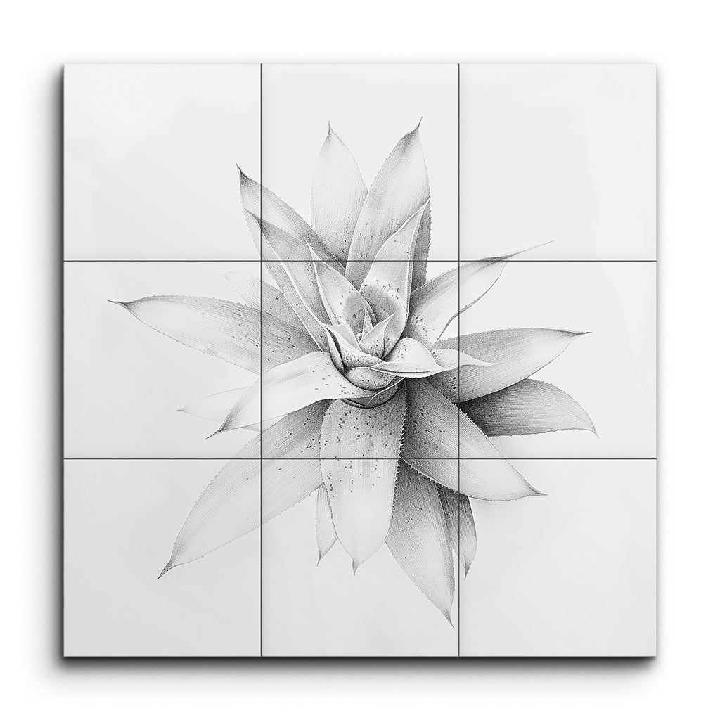 Transform your space with this stunning tile mural featuring a meticulously detailed, monochromatic drawing of a succulent plant. The artwork showcases elongated, pointed leaves that radiate symmetrically from the center, expertly shaded to create a three-dimensional effect. Delicate dots and lines add texture and lifelike detail, while the subtle gradations of gray tones emphasize the plant's natural curves and undulations. This highly realistic piece brings a touch of nature's elegance to any setting.