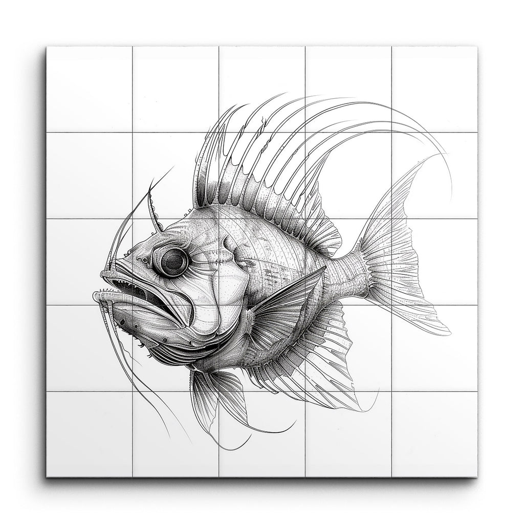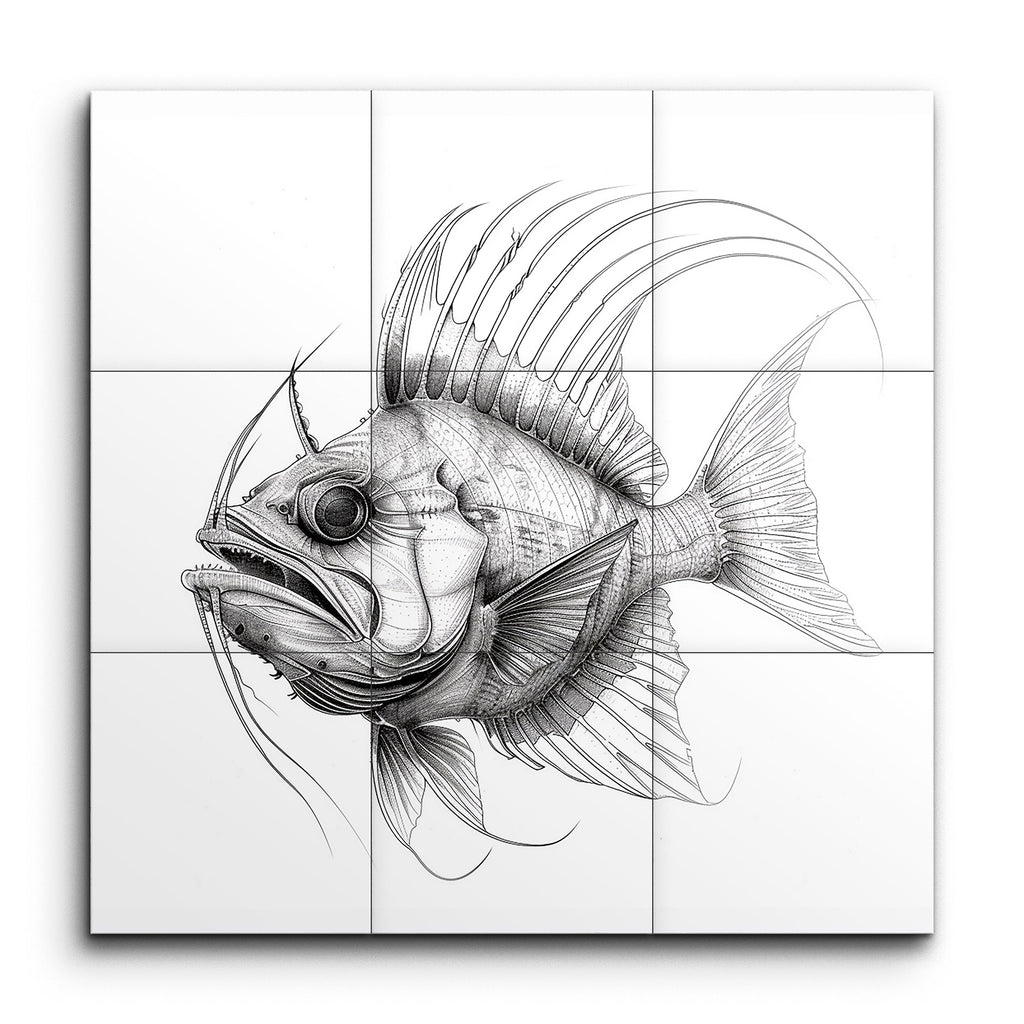 Immerse yourself in the captivating world of aquatic artistry with our exquisite tile mural featuring a monochromatic, highly detailed illustration of a fish. The artwork showcases an impressive blend of scientific precision and fine art, with intricate line work that brings every scale, fin, and facial feature to life. The fish's pronounced, rounded body, expressive eyes, and dramatic fins are rendered with meticulous attention to detail, creating a striking and elegant visual masterpiece that captivates and enchants.