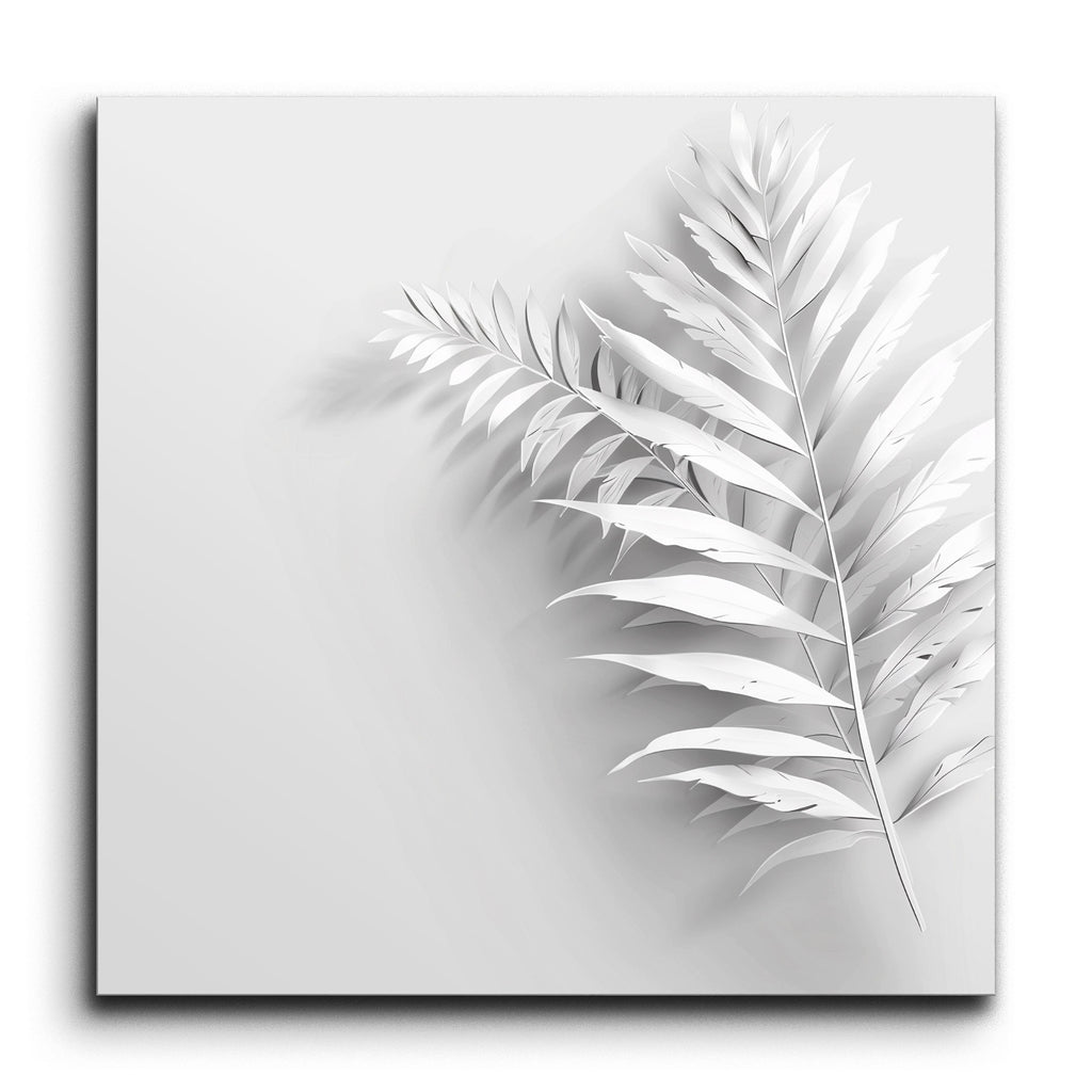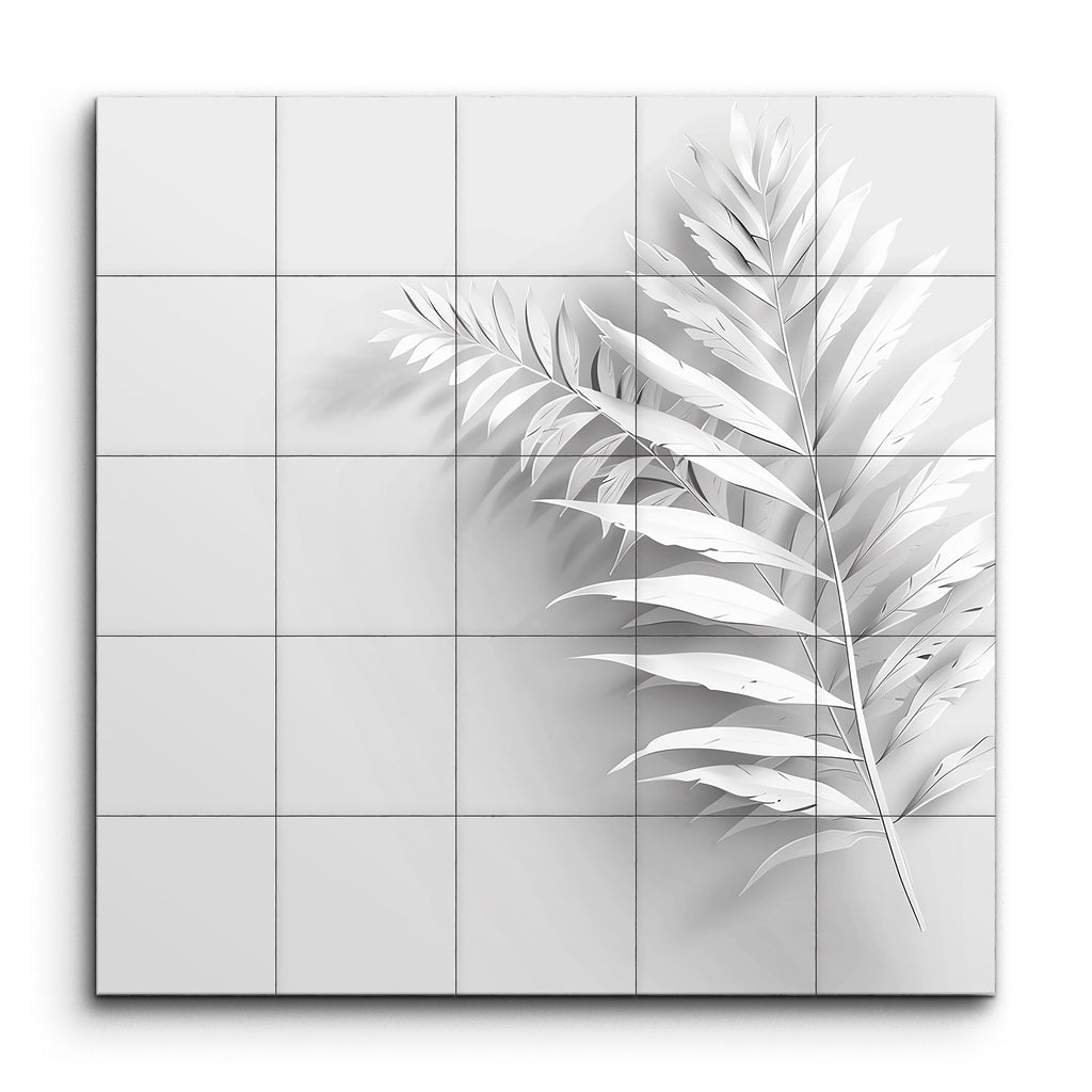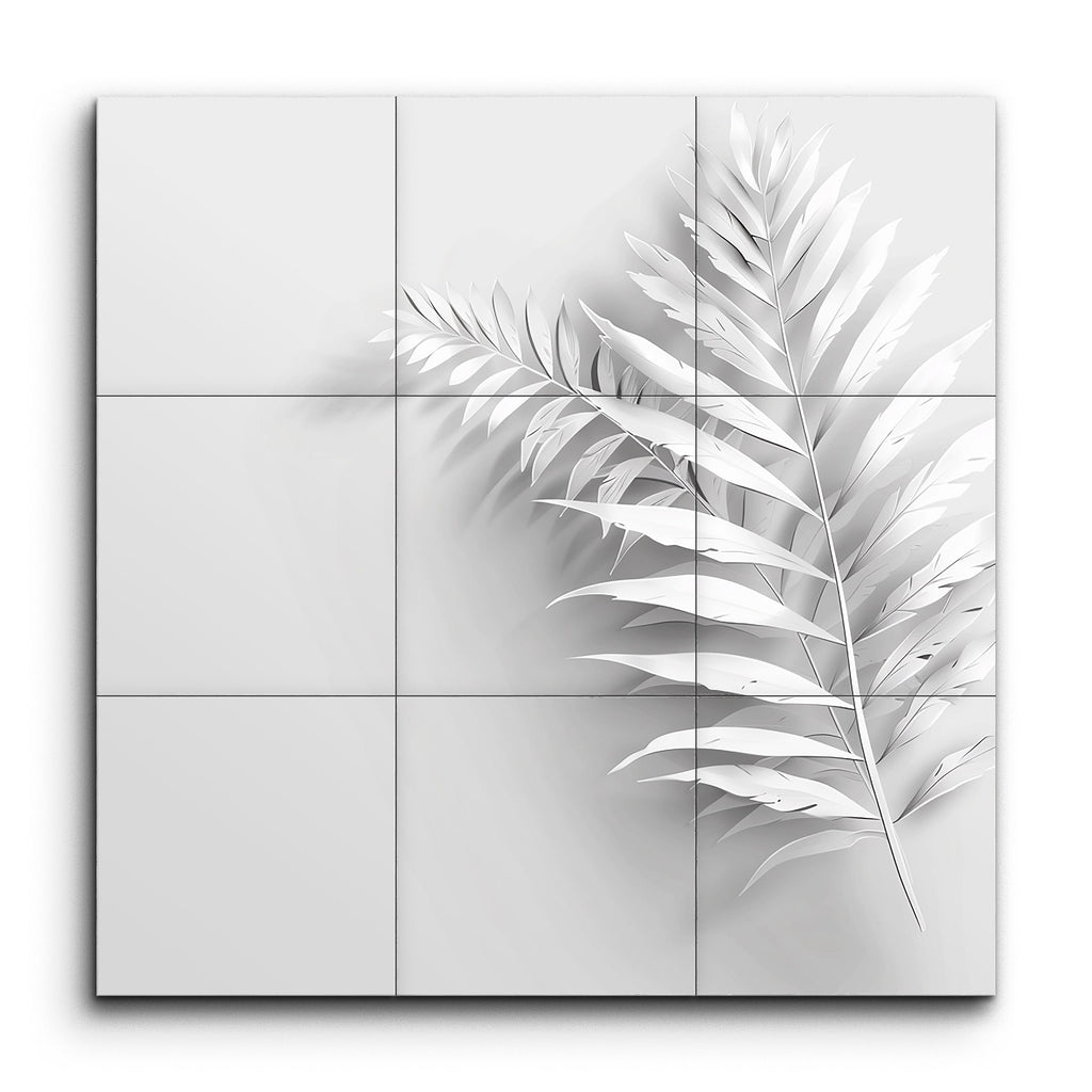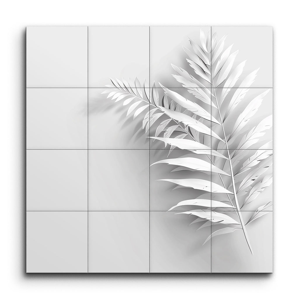Transform your space with this exquisite tile mural featuring a meticulously detailed fern leaf. Rendered in monochromatic white, the artwork exudes a minimalist and modern aesthetic. The elongated, narrow leaflets, with their slightly jagged edges, create a natural elegance and balance, enhanced by the shadows that add depth and dimension. The subtle shading and refined technique highlight the intricate structure, making this mural a stunning focal point of simplicity and sophistication.