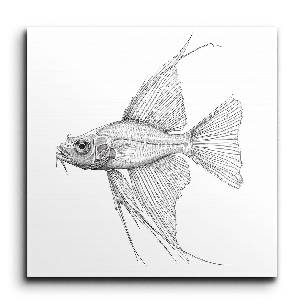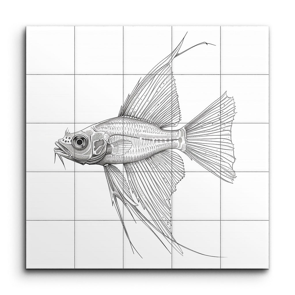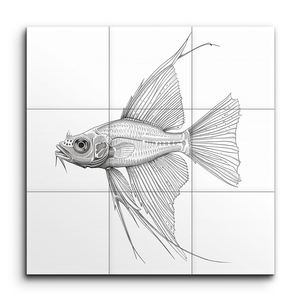 Immerse yourself in the captivating elegance of this monochromatic tile mural, featuring a meticulously detailed fish rendered in shades of grey and black. The realism in the artwork is striking, with fine lines and intricate details bringing the fish to life. Its elongated body, prominent dorsal fin, and fan-like tail create a harmonious composition. The expressive eye and textured scales add depth, making this mural a stunning centerpiece reminiscent of scientific illustrations.