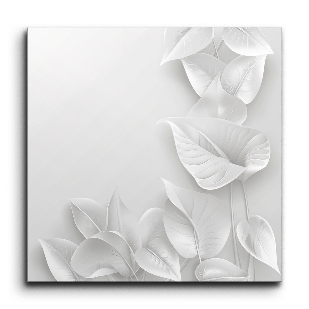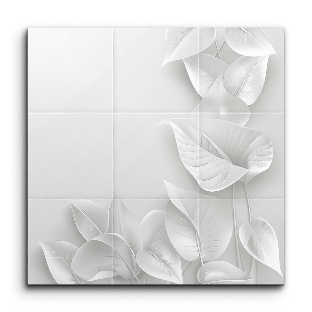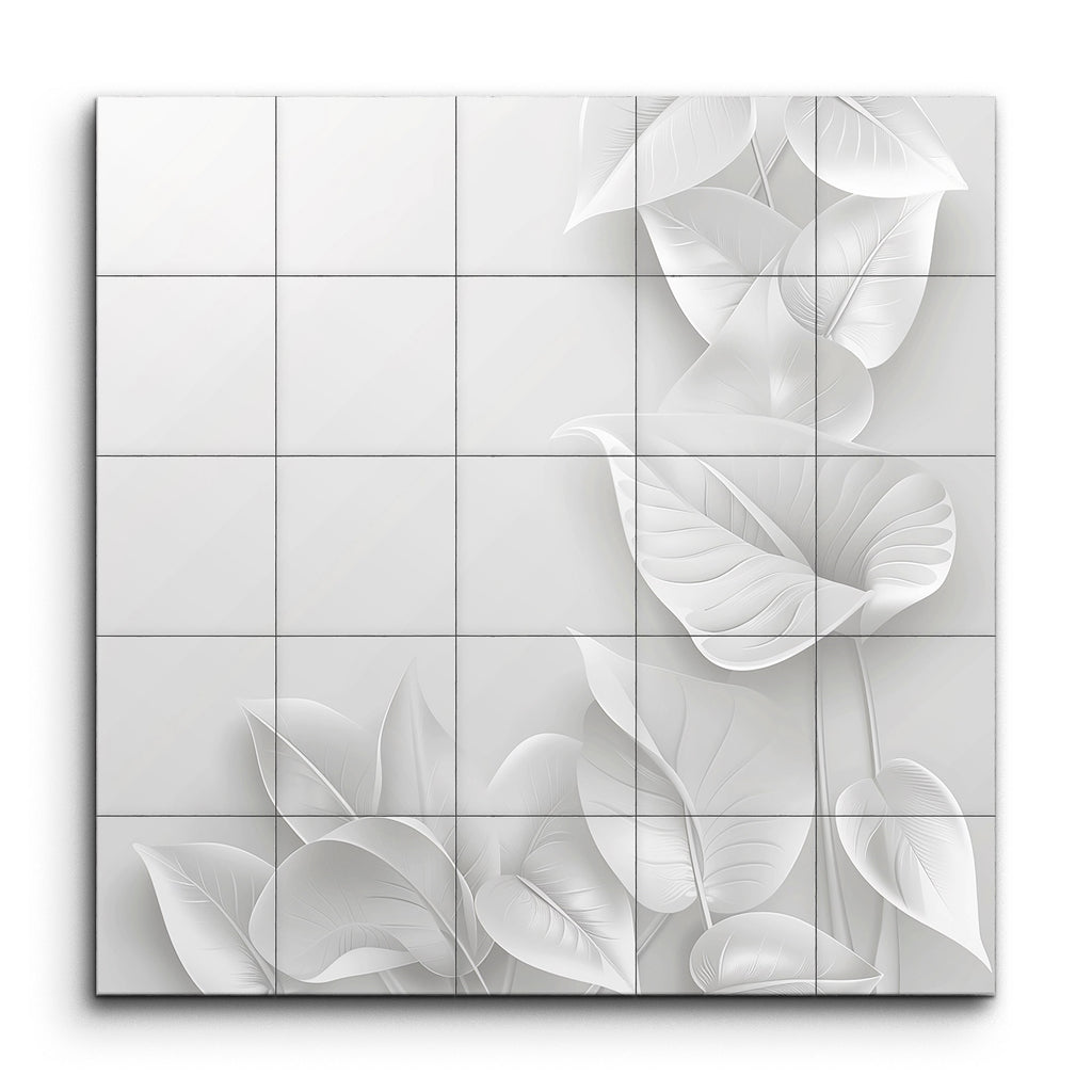 Transform your space with this captivating tile mural featuring a monochromatic masterpiece of intricately arranged leaves. Each leaf, depicted in varying sizes and shapes, intertwines smoothly with flowing lines and subtle gradients, creating a layered effect that exudes complexity. Delicate use of light and shadow enhances their three-dimensional, almost ethereal appearance. This minimalist yet elegant artwork emphasizes the natural beauty of the leaves, bringing a serene and sophisticated touch to any setting.
