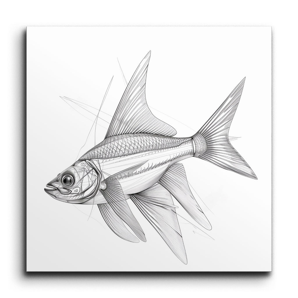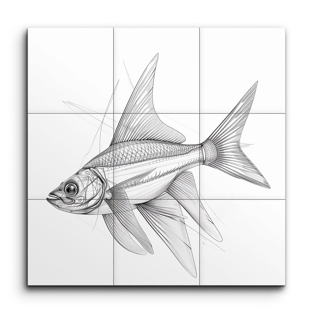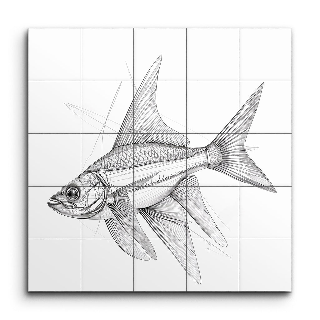 Immerse yourself in the captivating world of aquatic artistry with our tile mural featuring a meticulously detailed, monochromatic illustration of a fish. This scientifically inspired artwork captures the essence of marine life with precision and elegance. The fish, depicted in a side profile with extended fins, exudes a sense of motion and vitality. Intricate line work and cross-hatching bring depth and dimension, creating a stunning three-dimensional effect. A perfect blend of realism and artistic finesse, this mural is a testament to exquisite craftsmanship.
