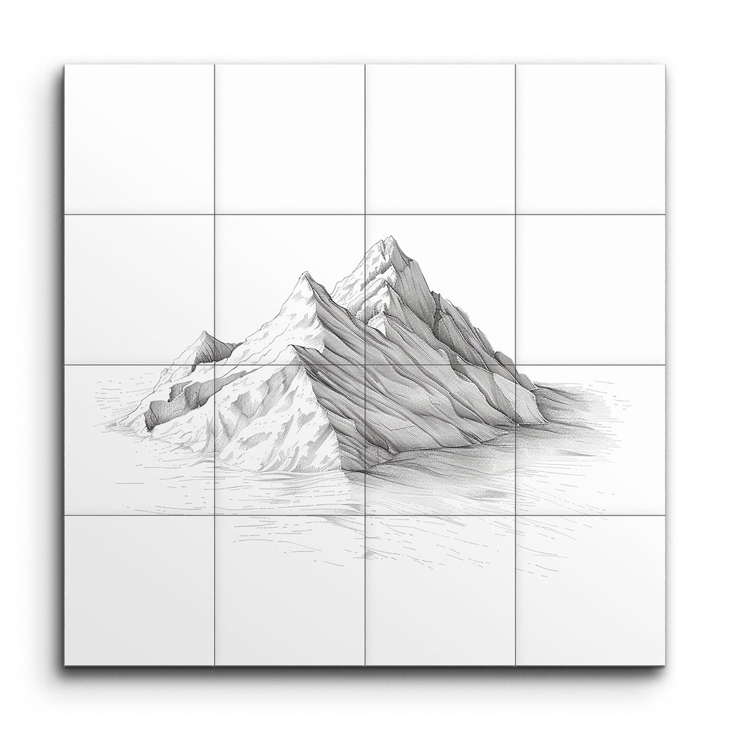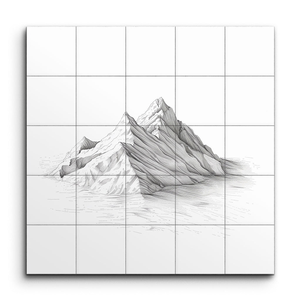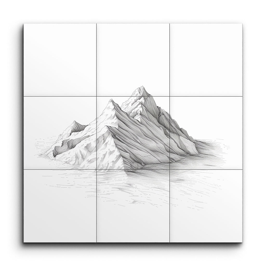 Experience the serene beauty of nature with our exquisite tile mural, featuring a minimalist and monochromatic depiction of a mountain range. Rendered with fine, precise lines, the artwork captures the rugged contours and ridges of the peaks with subtle shading techniques that create depth and texture. The clean, deliberate lines and use of negative space emphasize the natural elegance and intricate details of the mountainous landscape, making it a captivating centerpiece for any space.