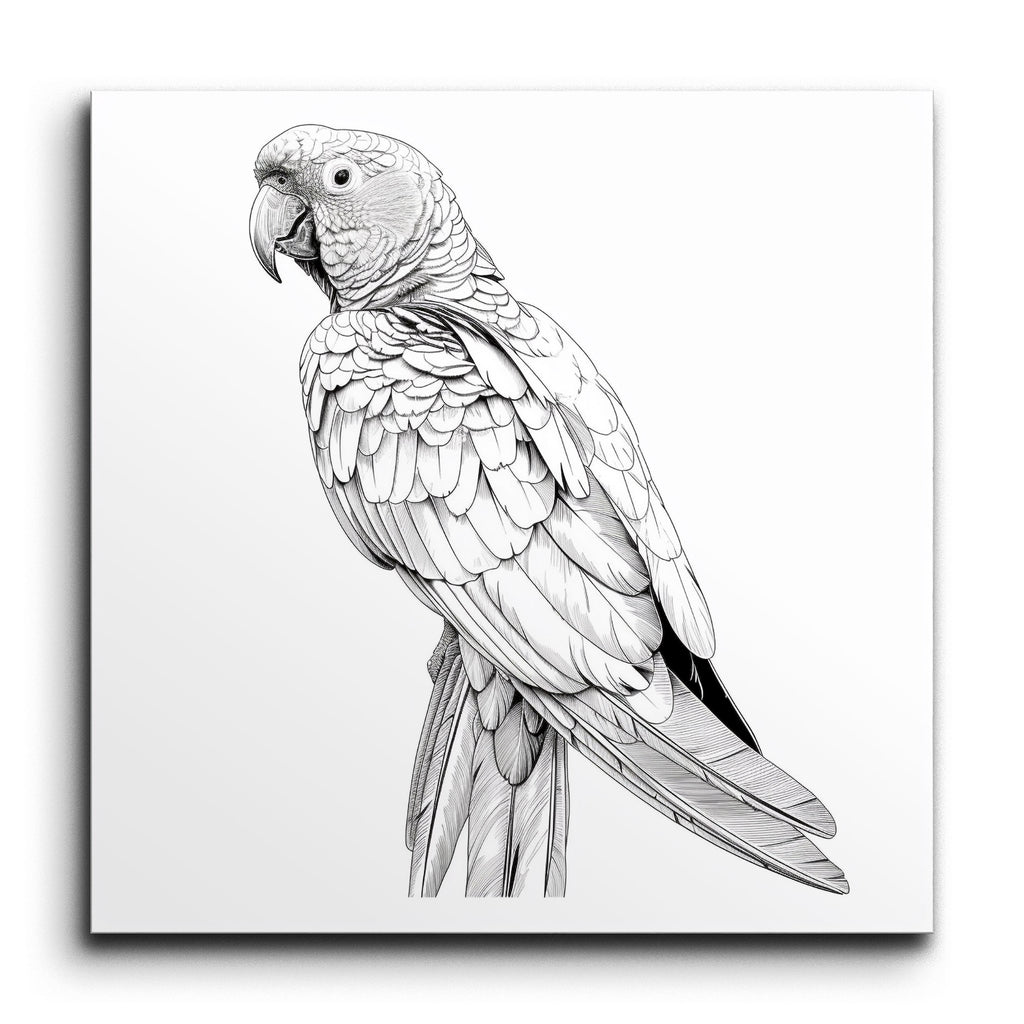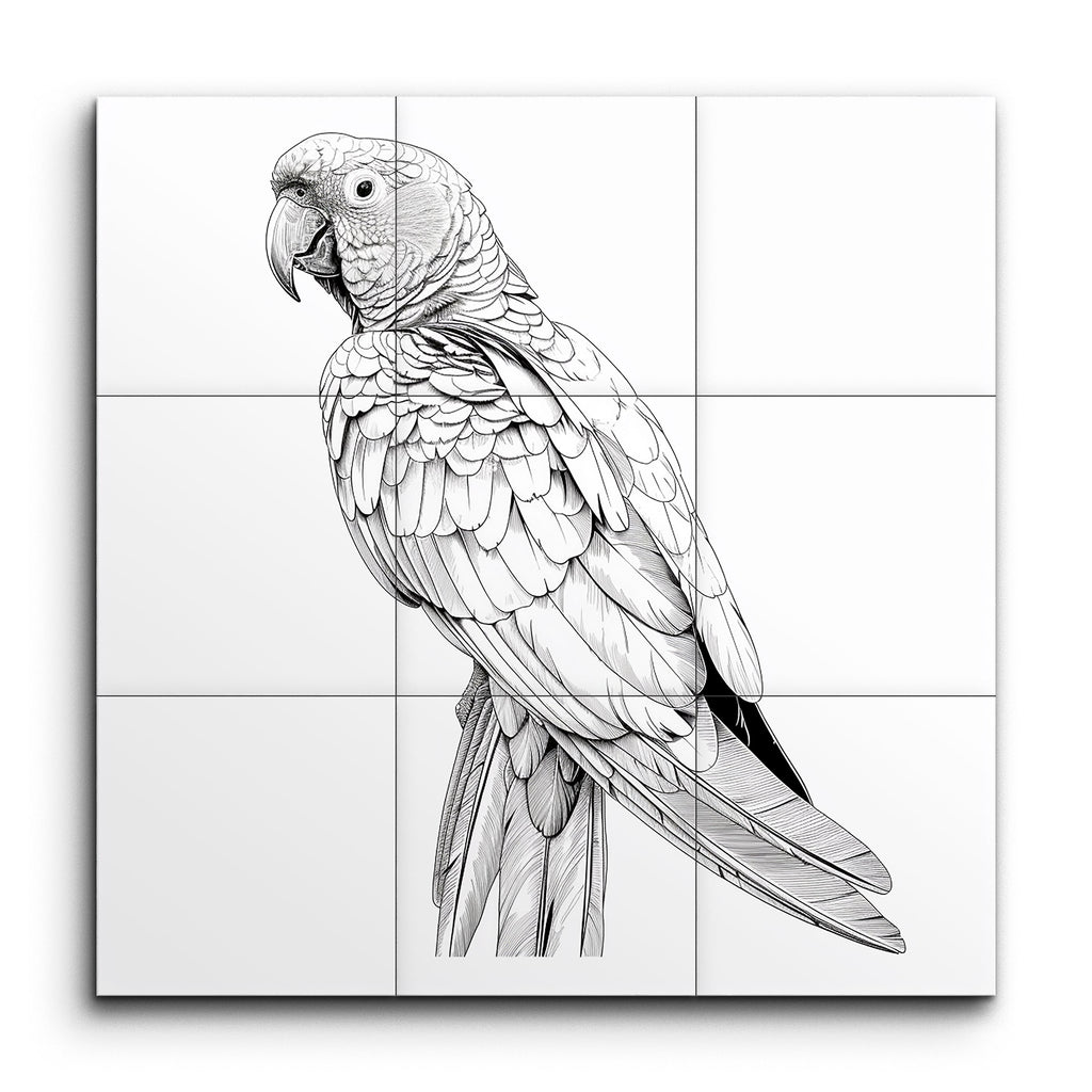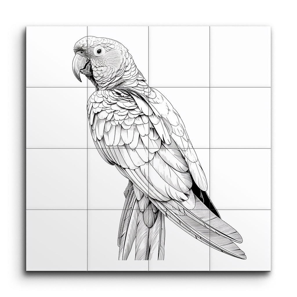 Transform your space with this captivating tile mural featuring a meticulously detailed parrot illustration. Rendered in a monochromatic palette, the artwork highlights the parrot in a side profile, showcasing its intricate feather patterns and textures with fine lines. The lifelike quality of the beak, eye, and claws adds depth and dimension, making this mural a striking focal point in any room. Perfect for those who appreciate the beauty of nature and the elegance of detailed craftsmanship.