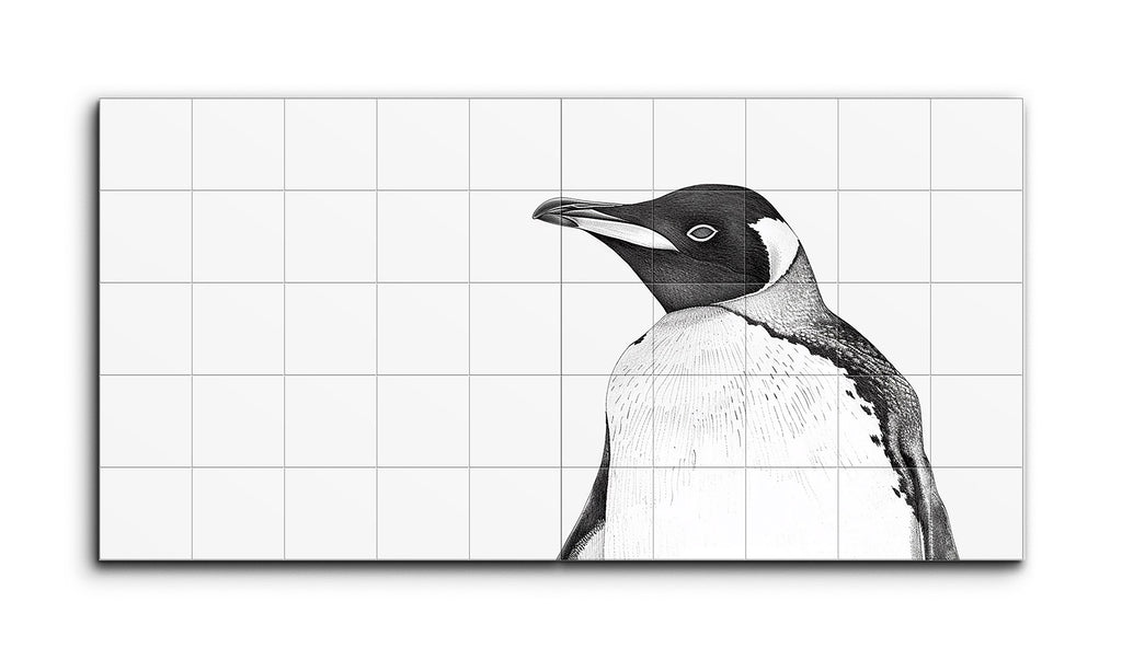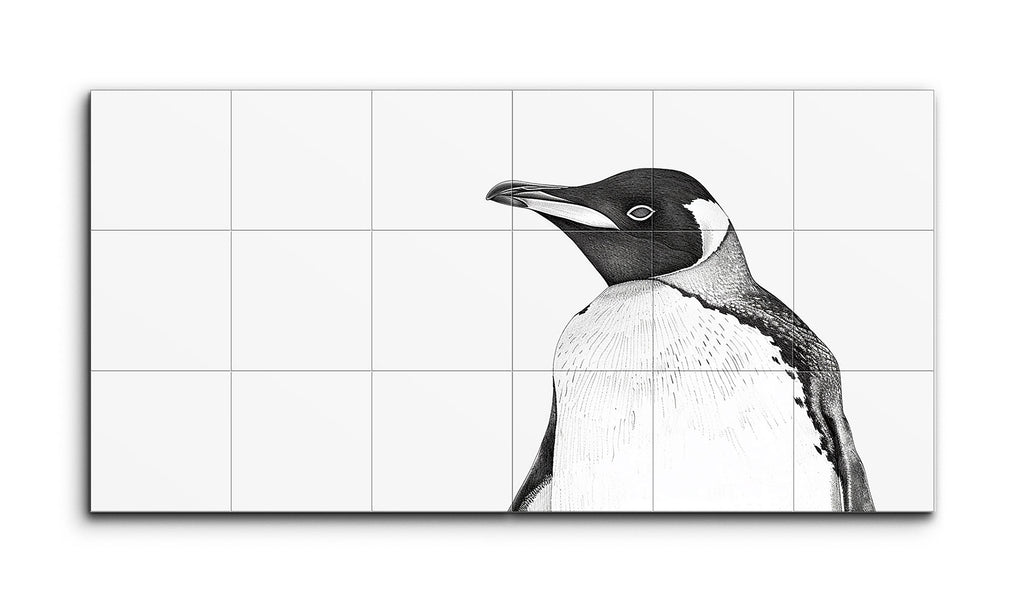 This tile mural showcases a realistic and naturalistic illustration of a penguin, split across two panels to form a striking diptych. Rendered in monochromatic black and white, the artwork highlights the texture and shading of the penguin's feathers with meticulous detail. The penguin's head and upper body are depicted with lifelike accuracy, including a highlighted eye and slightly open beak. Fine lines suggest the softness and density of its chest plumage, capturing the essence and character of the penguin.