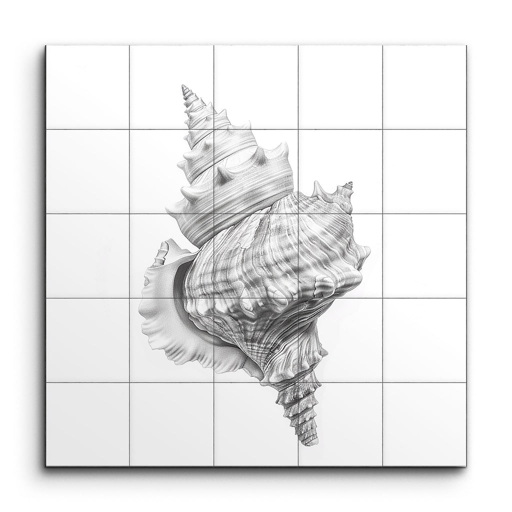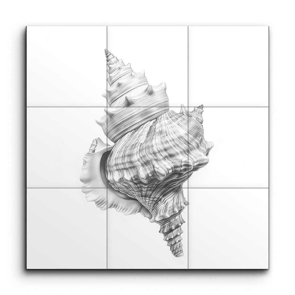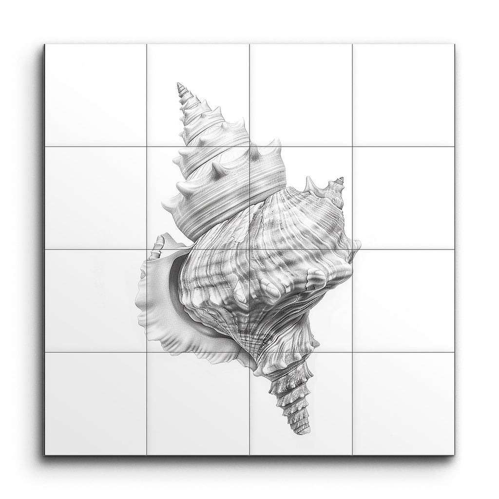 This tile mural showcases a hyper-realistic depiction of a seashell, captured in monochromatic shades of grey. The intricate textures, ridges, grooves, and spikes are meticulously detailed, highlighting the natural beauty of the spiral form. With expertly applied shading and highlights, the artwork creates a three-dimensional effect, making the shell appear almost tangible. This lifelike representation brings the essence of marine beauty into any space.