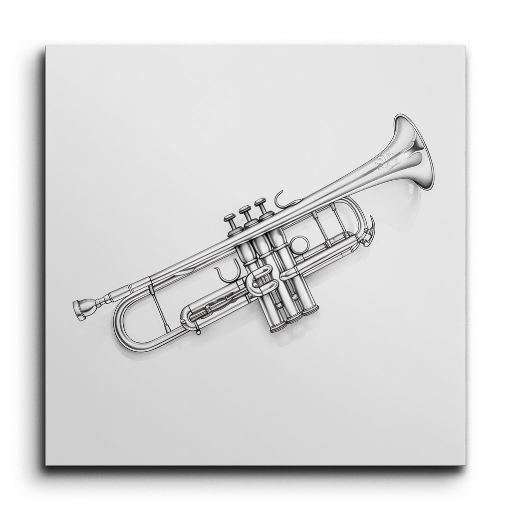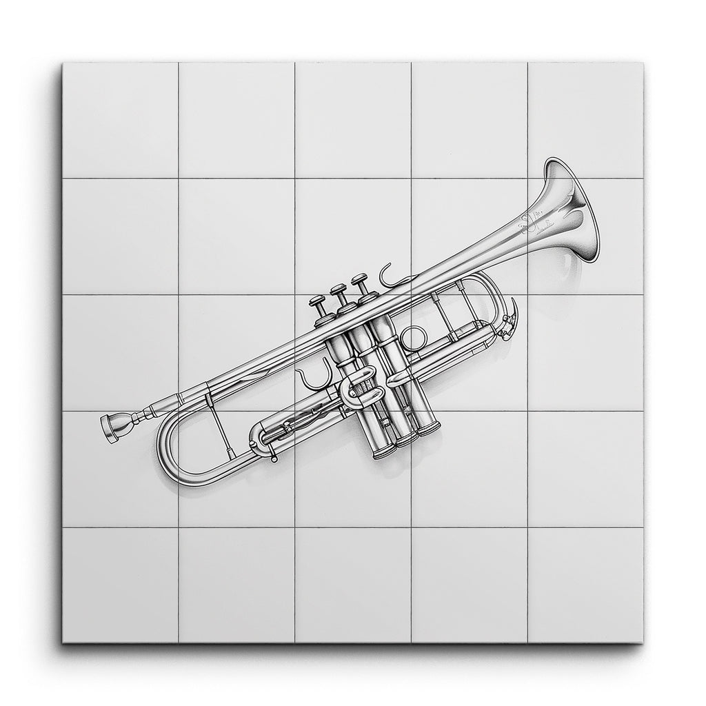 Elevate your space with a stunning tile mural showcasing a meticulously detailed monochromatic illustration of a trumpet. Rendered in shades of grey, this artwork captures the metallic sheen and intricate details of the instrument with striking realism. The minimalist design emphasizes the elegant form of the trumpet, with crisp lines and balanced proportions that highlight its contours and curves, creating a sophisticated and timeless piece perfect for any music lover's decor.