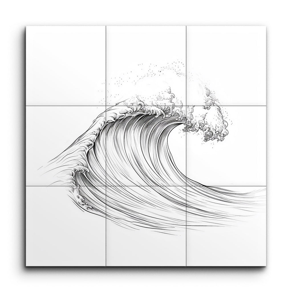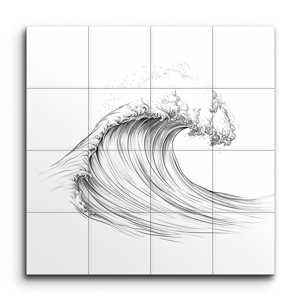 Immerse yourself in the dynamic beauty of our tile mural, featuring a stylized wave captured in monochromatic black-and-white. The intricate line work brings the wave to life, showcasing its fluid motion and frothy crest with stunning realism. This elegant, minimalistic composition merges traditional Japanese woodblock influences with modern design, creating a timeless and contemporary piece. Perfect for adding a touch of serene power and artistic sophistication to any space.