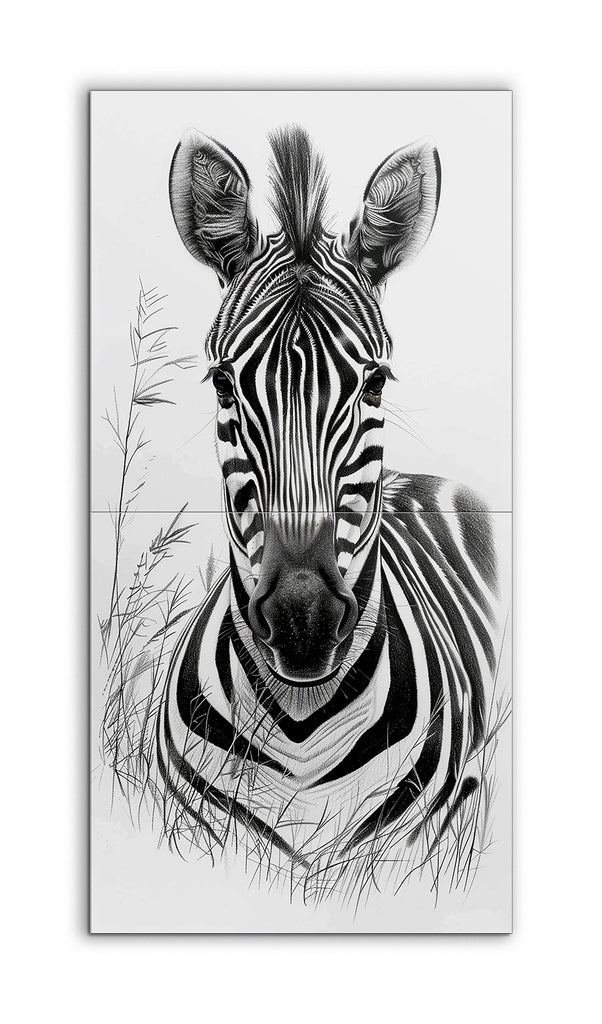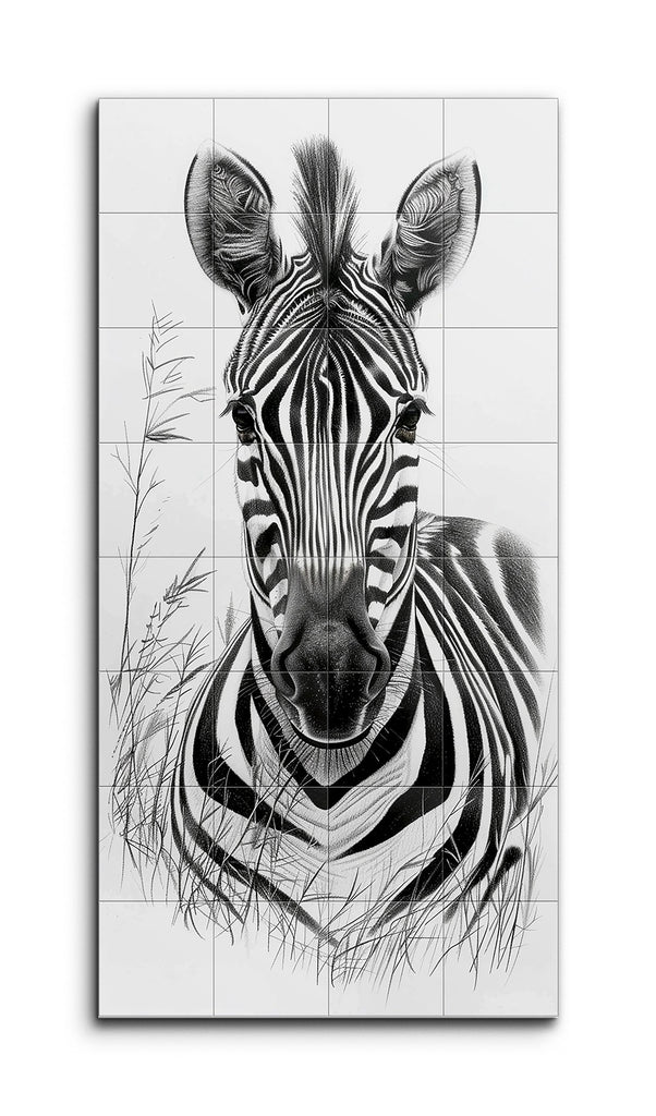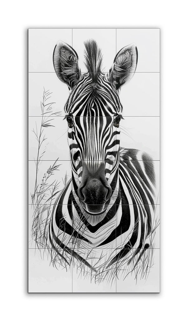 This tile mural showcases a hyper-realistic black-and-white illustration of a zebra, captured with exceptional precision. The zebra faces forward, with its head and upper body prominently displayed, highlighting its distinctive black and white stripes. The artist's meticulous detailing brings out the natural patterns and textures of the zebra's fur, expressive eyes, and finely lined mane. Delicate grasses surround the zebra, suggesting its natural habitat and adding depth to the composition. The monochromatic scheme enhances the intricate patterns, making it a visually captivating piece.