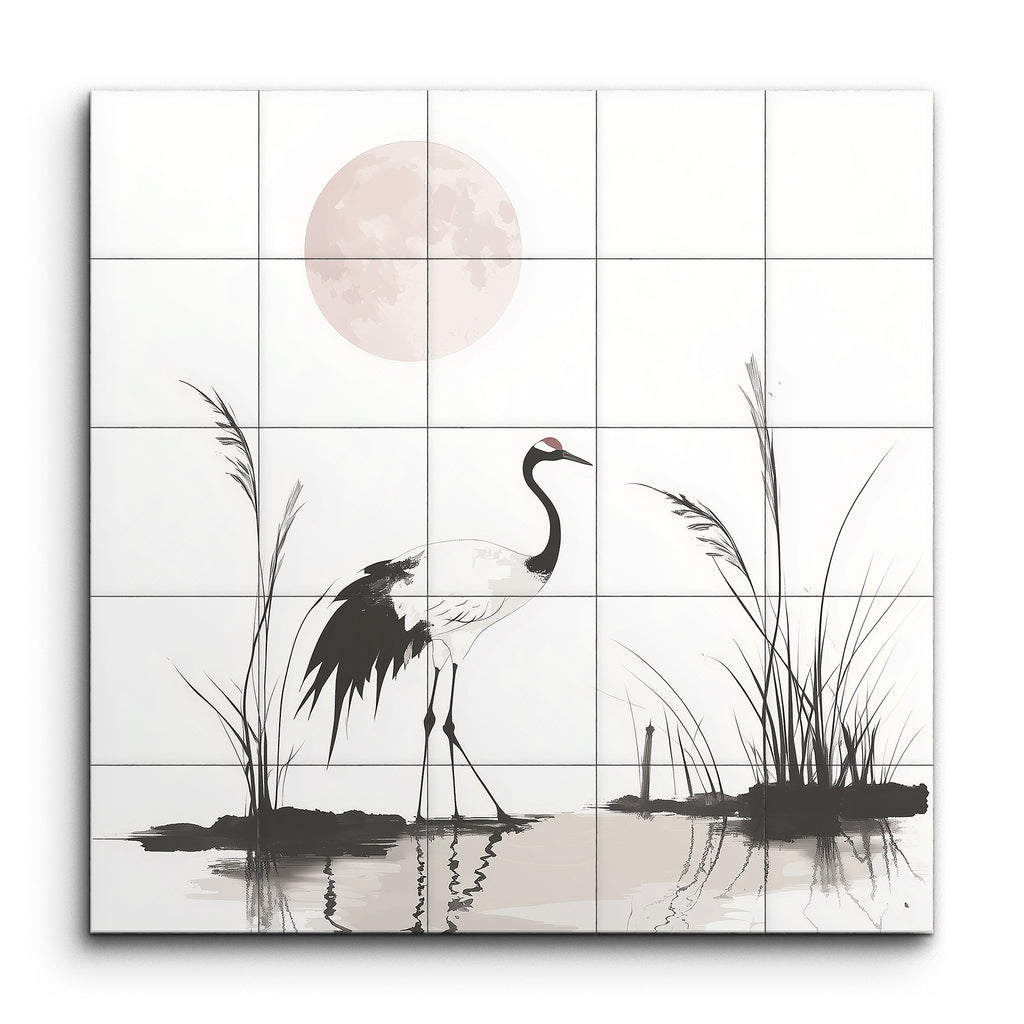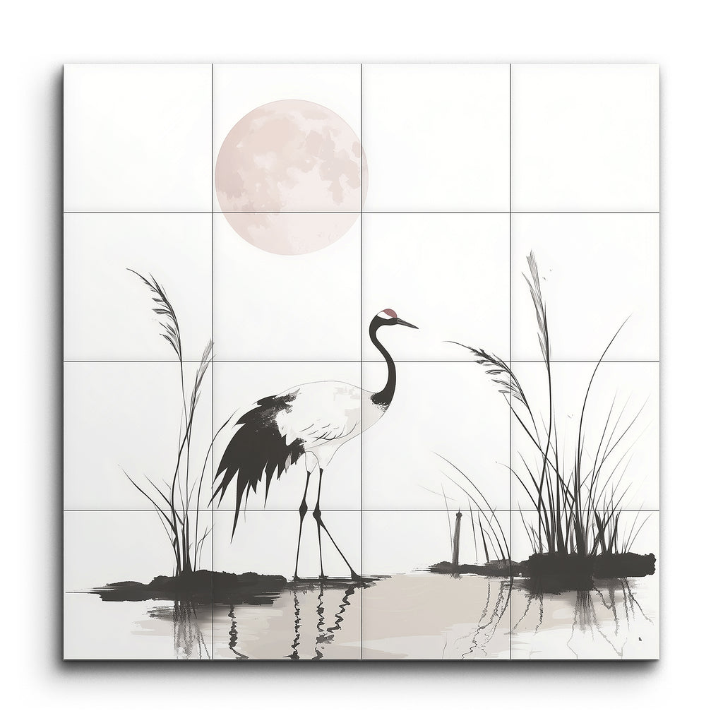 This tile mural presents a serene scene of a crane gracefully poised in shallow water, captured in a minimalist style. The artwork highlights the crane's elegant form, with its long neck and legs, and delicate plumage rendered in subtle black and white. Gentle reeds and grasses surround the bird, enhancing the natural setting. A softly glowing moon illuminates the scene, adding to the tranquil ambiance. Inspired by traditional Japanese ink wash painting, the composition exudes calmness and balance through its simplicity and use of negative space.
