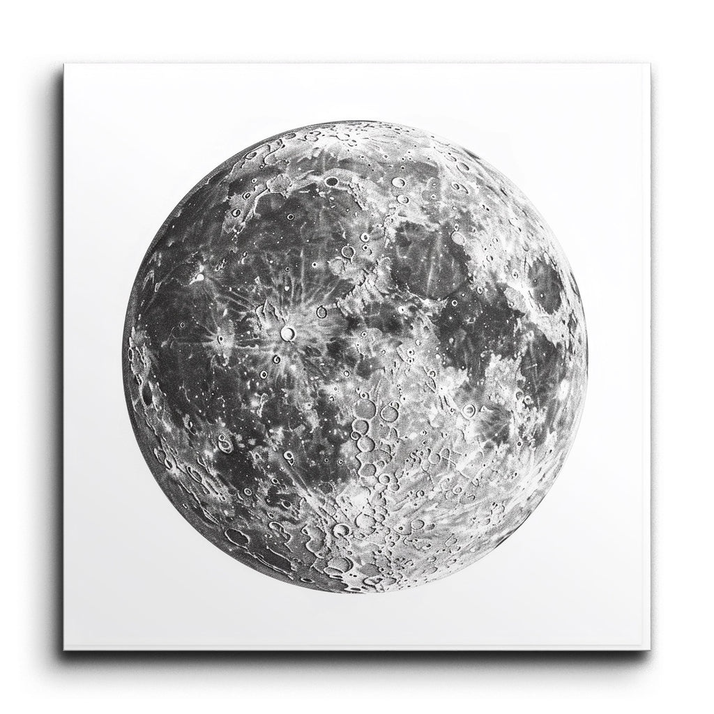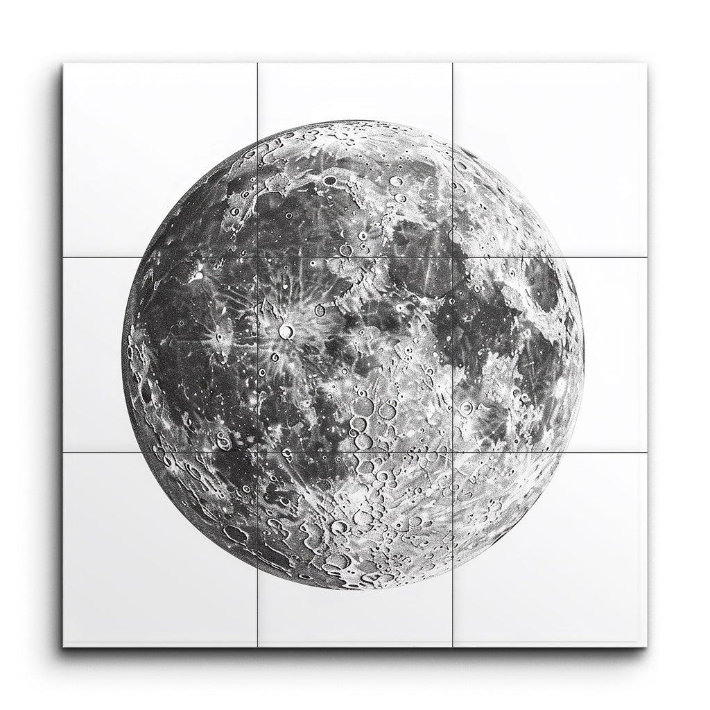 Transform your space with this captivating tile mural featuring a photorealistic depiction of the Moon. The artwork, rendered in a striking grayscale palette, offers a meticulously detailed view of the lunar surface. Each crater, basin, and highland is intricately portrayed, highlighting the rugged terrain and geological history of our celestial neighbor. The dramatic contrasts and shading create a three-dimensional effect, drawing you into the Moon's mesmerizing texture and timeless allure.