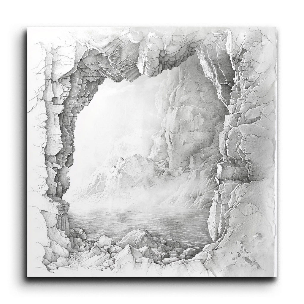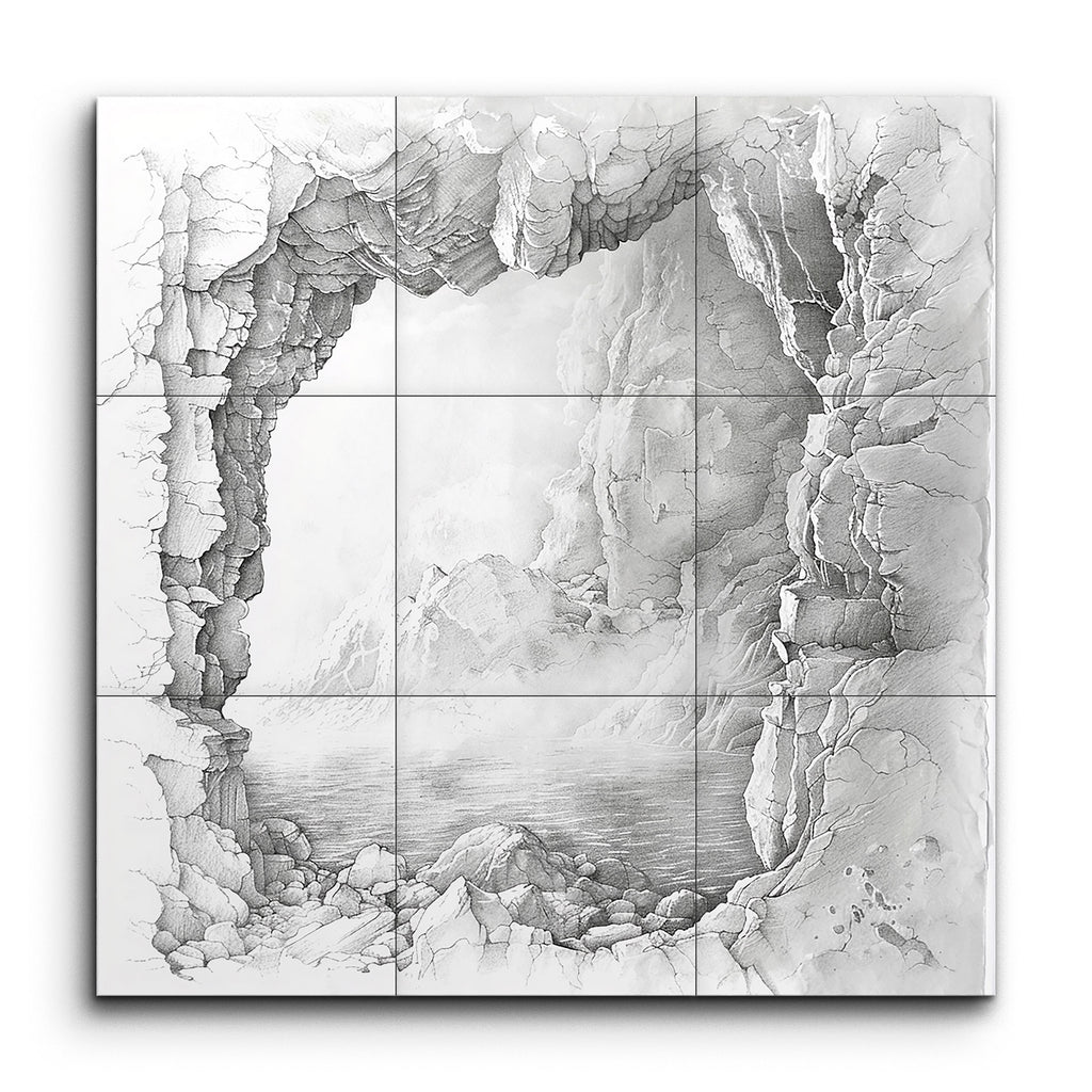 Transform your space with this mesmerizing tile mural featuring a highly detailed pencil drawing of a cave entrance leading to a serene, misty landscape. The rocky cave walls are intricately rendered, framing a distant view of calm waters with gentle ripples. The mist adds depth and mystery, creating an ethereal atmosphere. The balanced composition, contrasting the rugged cave with the smooth mist and water, invites tranquility and a sense of wonder into any setting.