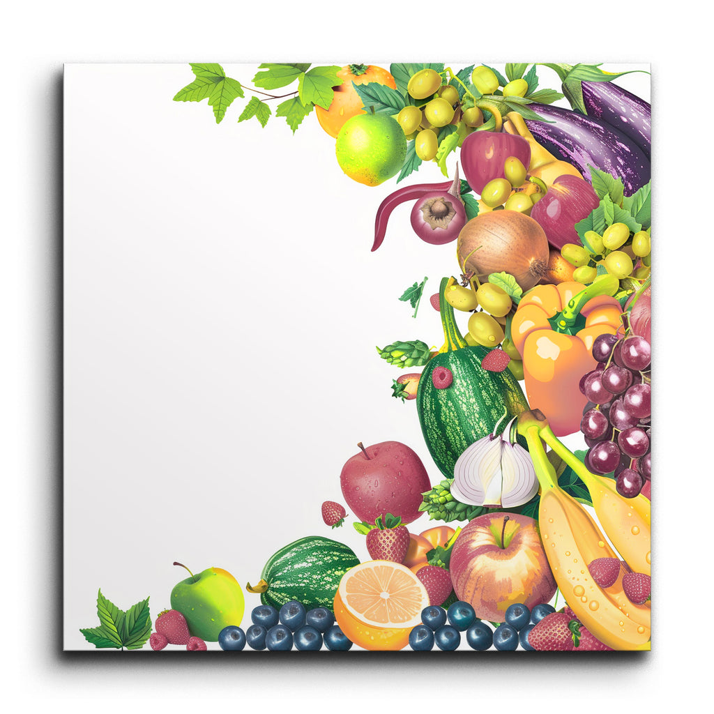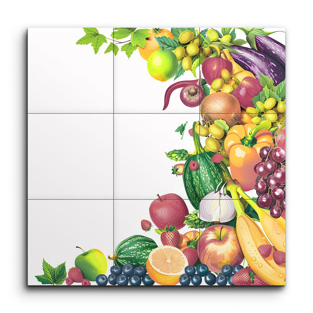 Immerse yourself in the vibrant world of nature's bounty with this stunning tile mural. This masterpiece features a lifelike illustration of diverse fruits and vegetables, meticulously arranged in a semi-circular pattern. The top right corner bursts with clusters of grapes, eggplants, lemons, and yellow peppers, while the bottom left showcases a rich assortment of apples, oranges, strawberries, and more. The dynamic composition and vivid colors celebrate the natural beauty and abundance of fresh produce, bringing a touch of freshness and vitality to any space.