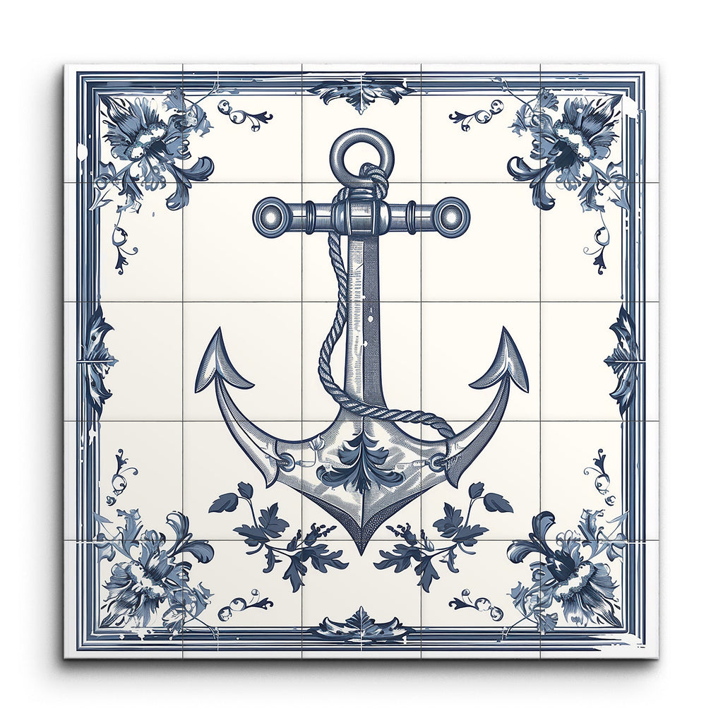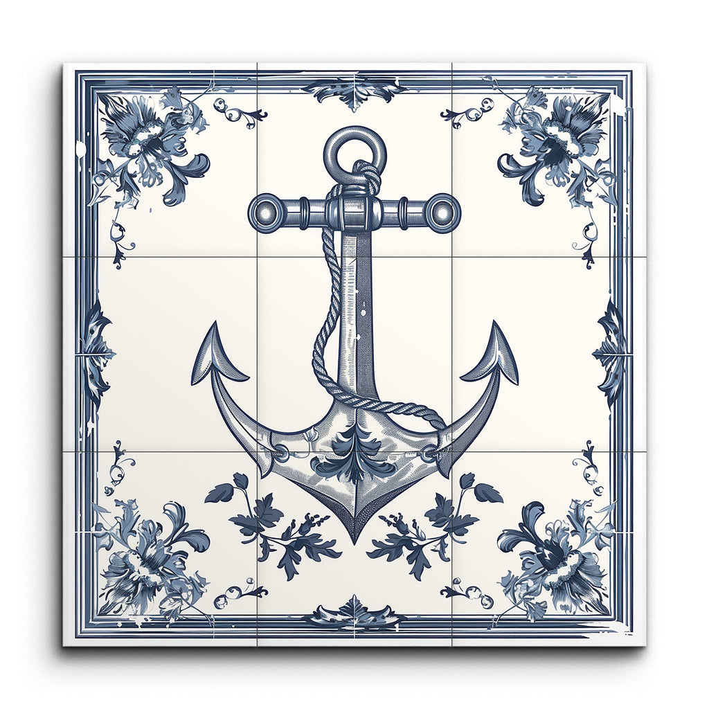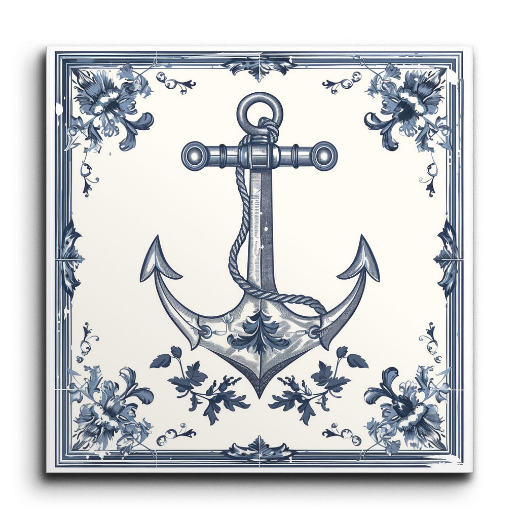 Immerse your space in nautical elegance with this stunning tile mural. At its heart, a meticulously illustrated anchor in rich shades of blue commands attention, its three-dimensional appearance brought to life with intricate shading. A finely detailed rope entwines the anchor, enhancing its maritime charm. Surrounding this central motif, an ornate border of floral patterns in harmonious blue hues frames the scene with delicate line work, evoking the timeless beauty of traditional Delftware.