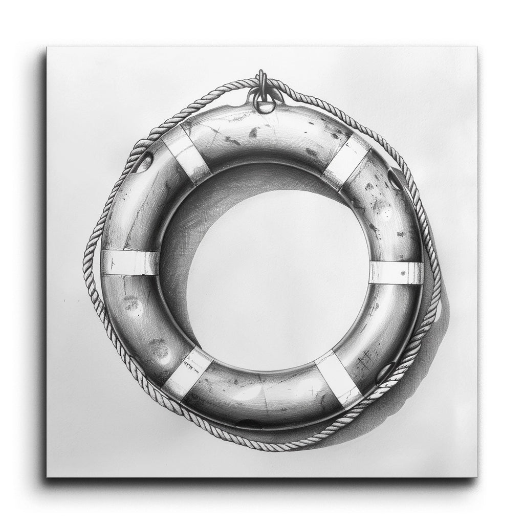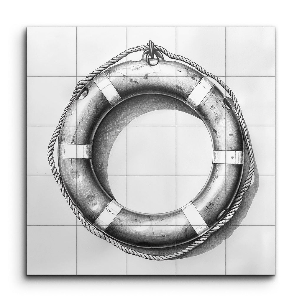 Elevate your space with this captivating tile mural, featuring a meticulously detailed monochromatic illustration of a life preserver. The artwork showcases a circular, weathered life preserver adorned with white bands for grip, encircled by a twisted, slightly frayed rope. The skillful shading and highlights lend a three-dimensional realism, capturing the essence of wear and exposure. This timeless, highly realistic piece brings a touch of classic nautical charm, perfect for any setting.