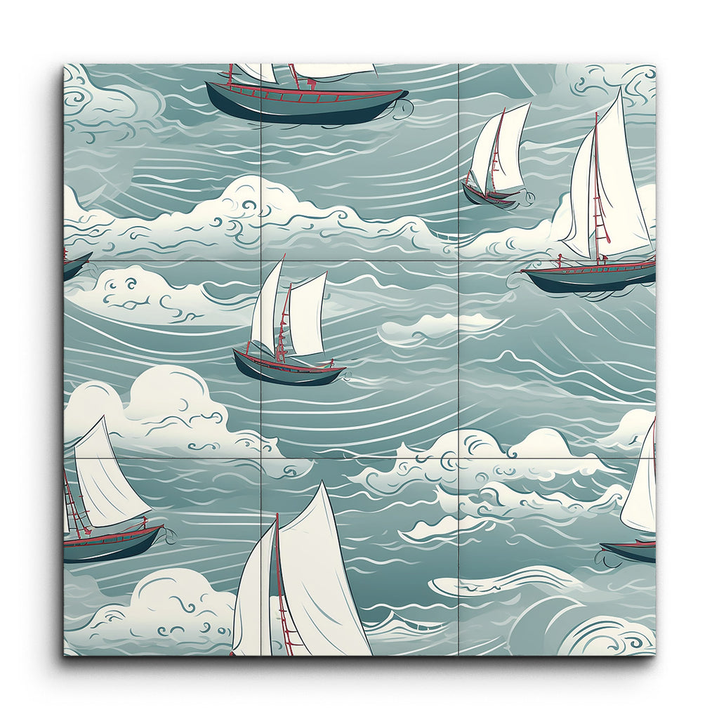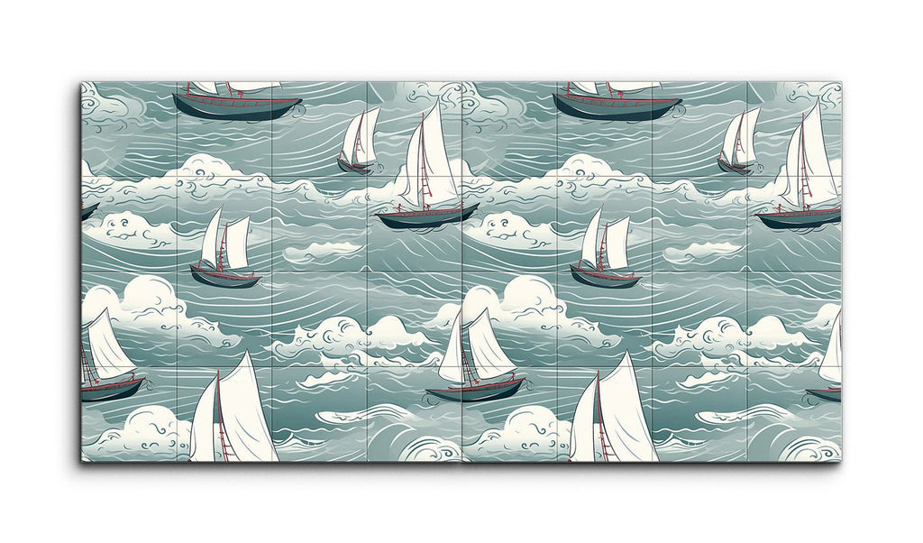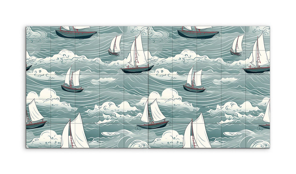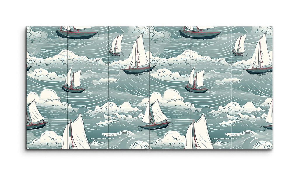 Transform your space with this captivating tile mural, featuring a dynamic nautical scene. Several sailboats with white sails and red accents navigate a turbulent sea, rendered in a minimalistic style. The swirling waves and fluffy clouds create a sense of movement and energy, while the cool tones of blue and teal dominate the composition. Reminiscent of vintage maritime illustrations with a modern twist, the bold outlines and intricate patterns make this piece both striking and harmonious.