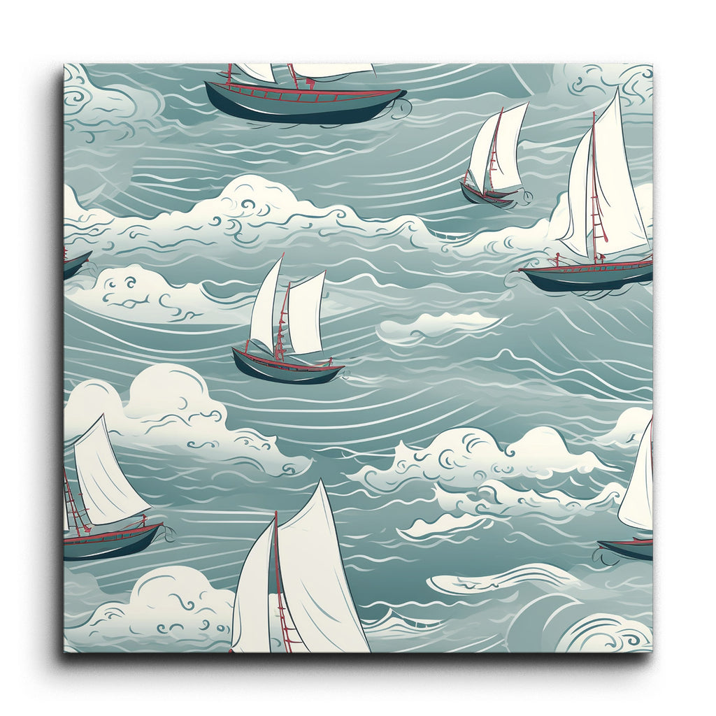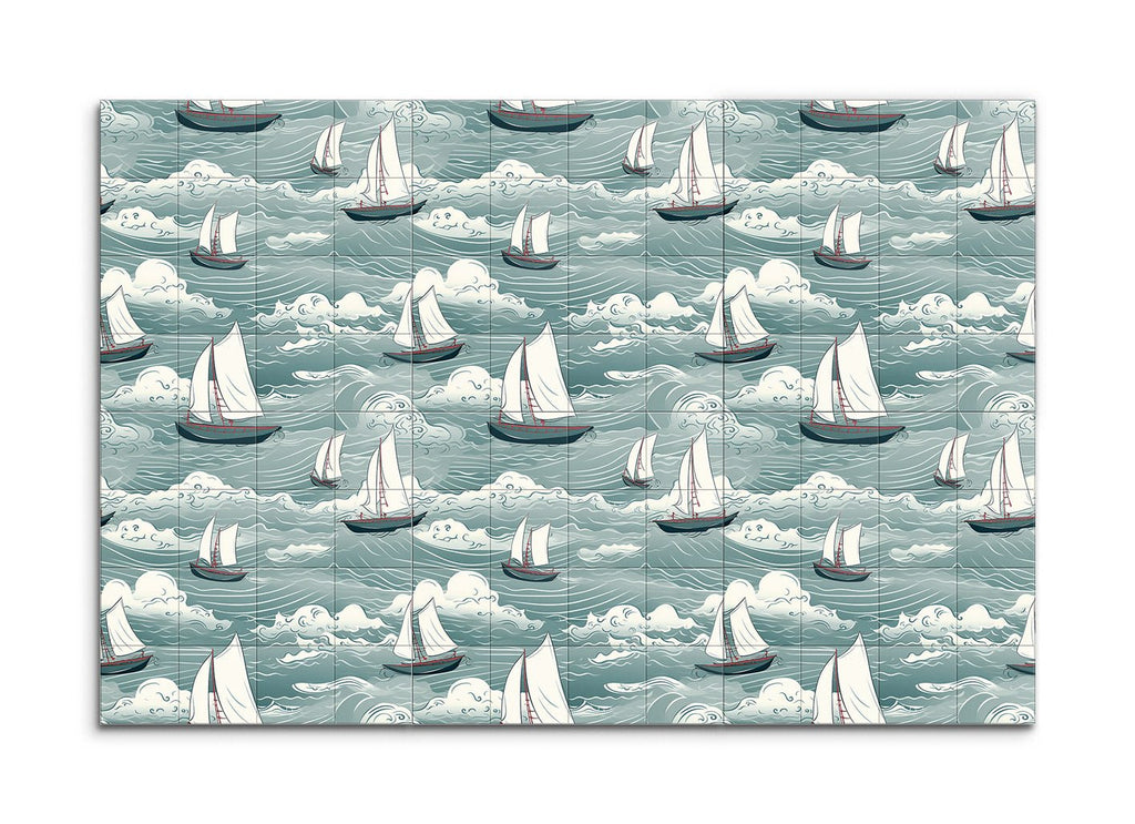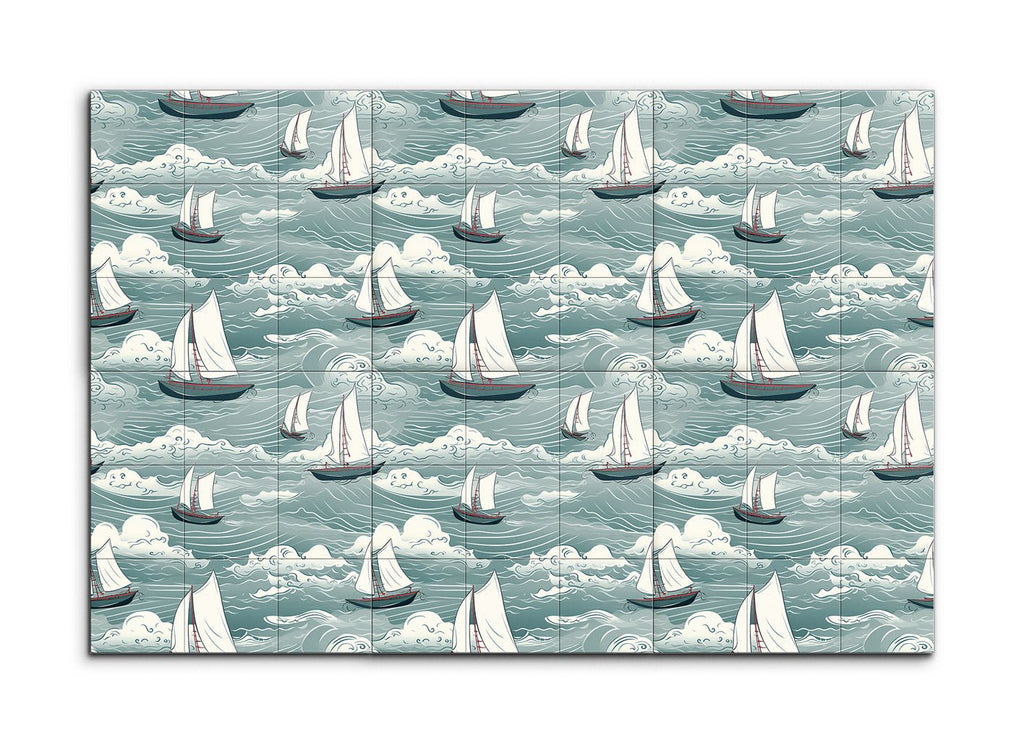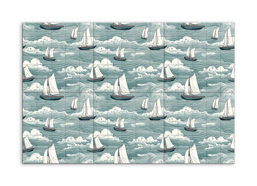 Transform your space with this captivating tile mural, featuring a dynamic nautical scene. Several sailboats with white sails and red accents navigate a turbulent sea, rendered in a minimalistic style. The swirling waves and fluffy clouds create a sense of movement and energy, while the cool tones of blue and teal dominate the composition. Reminiscent of vintage maritime illustrations with a modern twist, the bold outlines and intricate patterns make this piece both striking and harmonious.