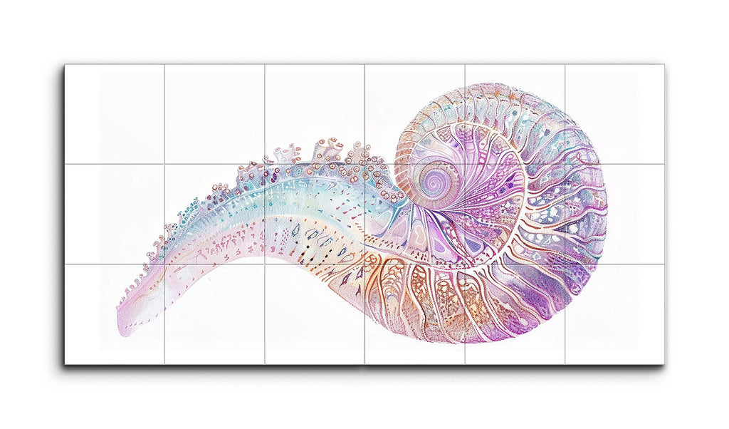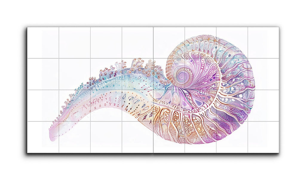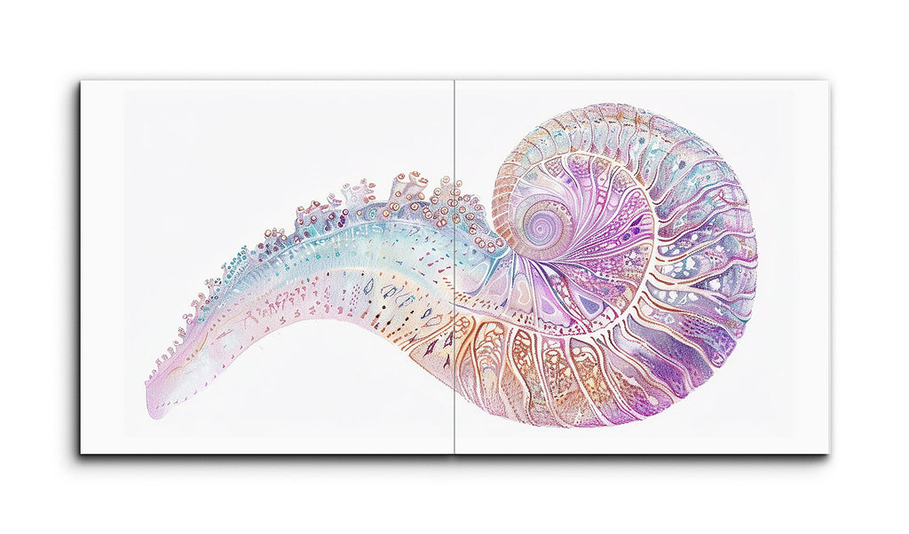 This diptych tile mural features a meticulously illustrated nautilus shell, celebrated for its logarithmic spiral and natural elegance. The shell captivates with intricate patterns and textures, rendered in soft pastels—pink, purple, blue, and hints of yellow—that blend harmoniously. The mandala-like designs within each chamber enhance the visual depth, creating a whimsical and ethereal quality. The central positioning and smooth color gradients invite contemplation of both nature and artistry.