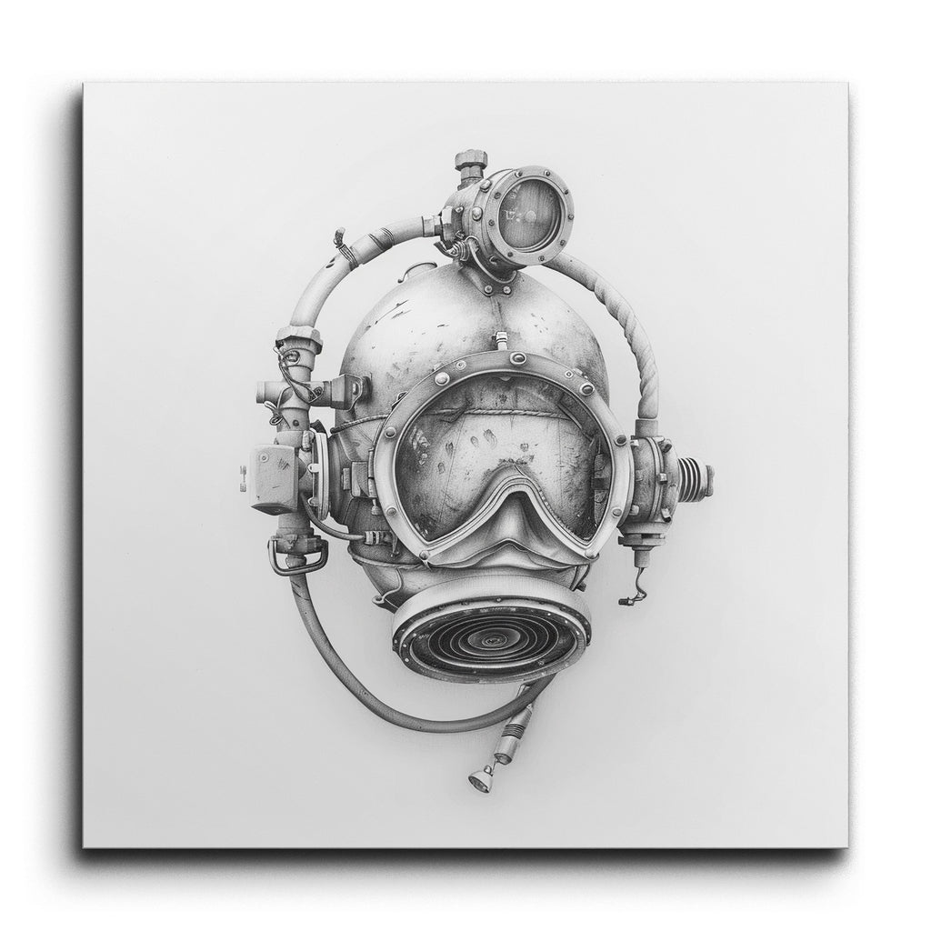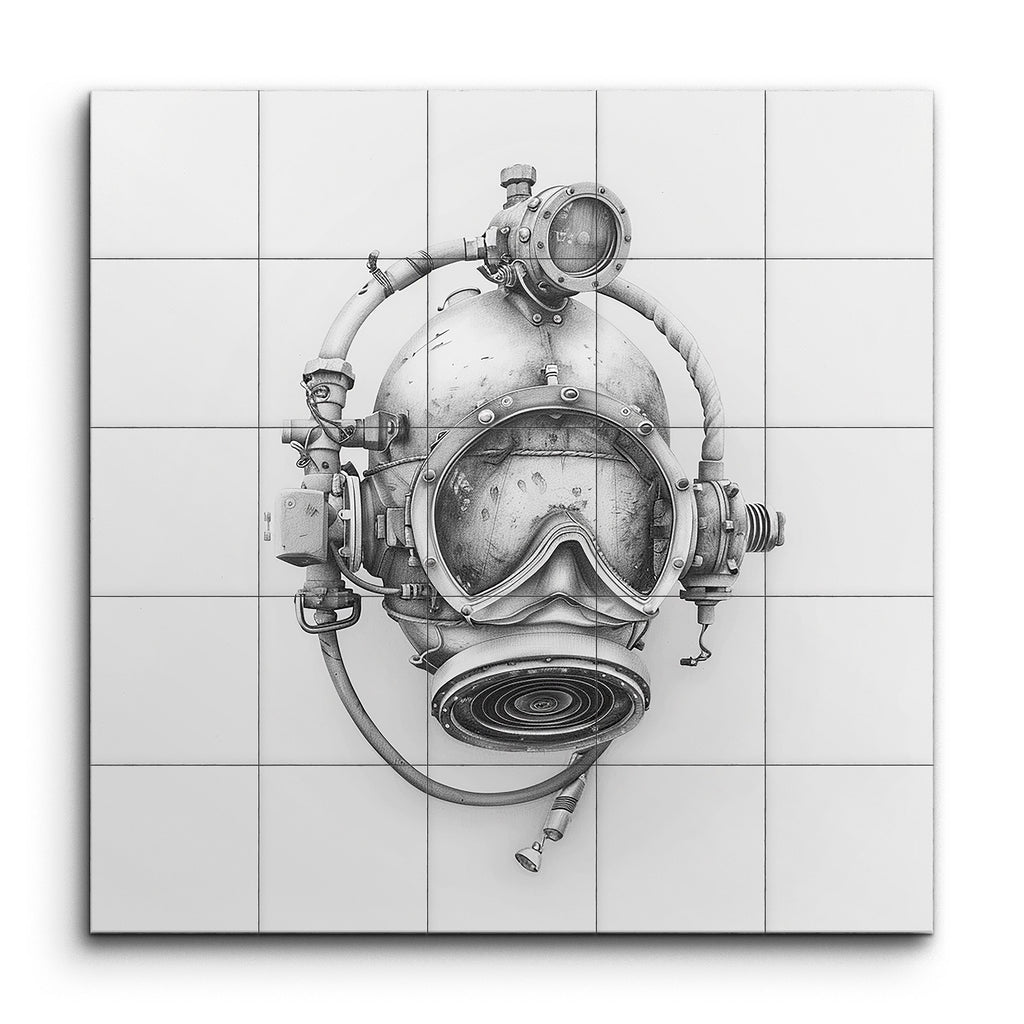 Immerse yourself in the nostalgic allure of maritime history with our tile mural, featuring a meticulously detailed illustration of a vintage deep-sea diving helmet. Rendered in monochromatic grayscale, each line and texture brings a three-dimensional feel to the piece. The artist's precision captures the essence of old-fashioned diving gear, complete with a rounded glass viewport, bolts, rivets, and connected hoses. This mural evokes the spirit of historical deep-sea exploration with its technical, blueprint-like style and weathered, aged appearance.