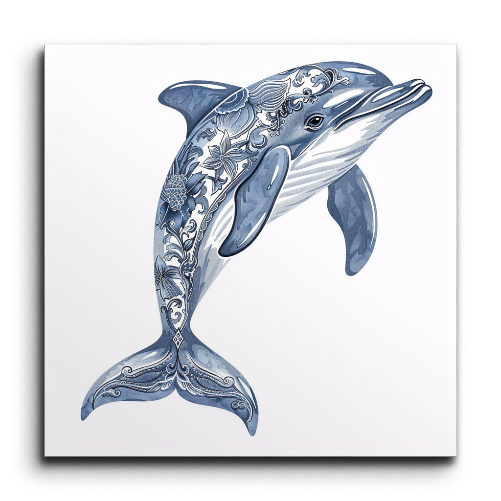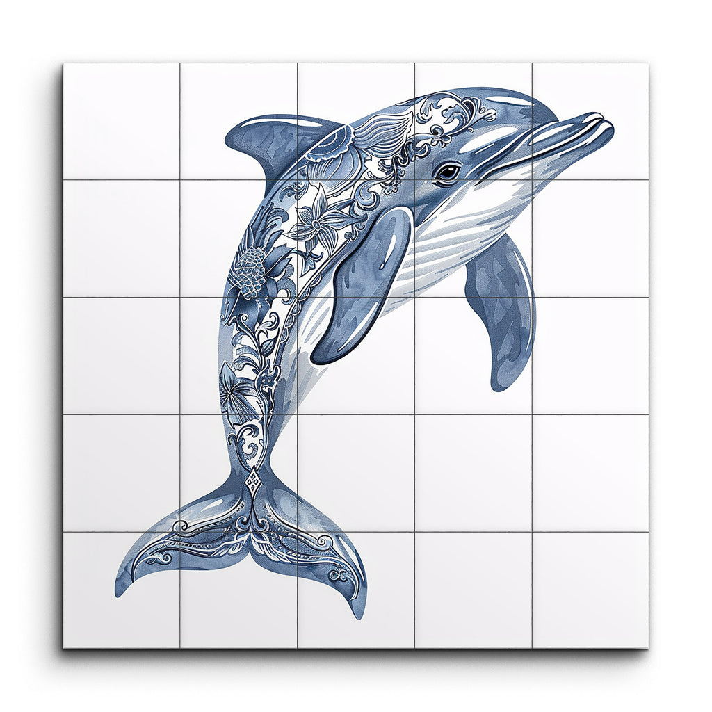 Dive into an ocean of elegance with this captivating tile mural, featuring a stylized dolphin in dynamic motion. Rendered in soothing shades of blue and gray, the leaping dolphin is adorned with intricate patterns and motifs that blend natural and abstract forms. Detailed floral elements, swirls, and geometric shapes embellish its body, creating a harmonious fusion of realism and fantasy. This unique artwork brings a touch of the ocean's mystique and beauty to any space.