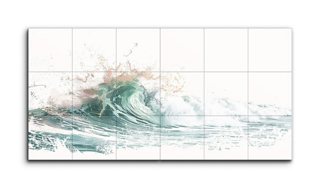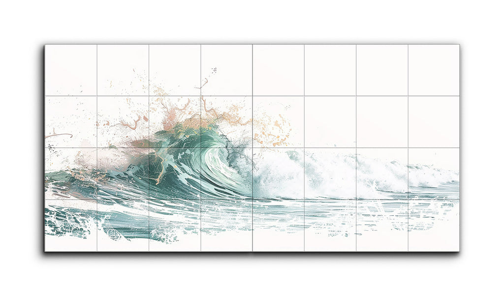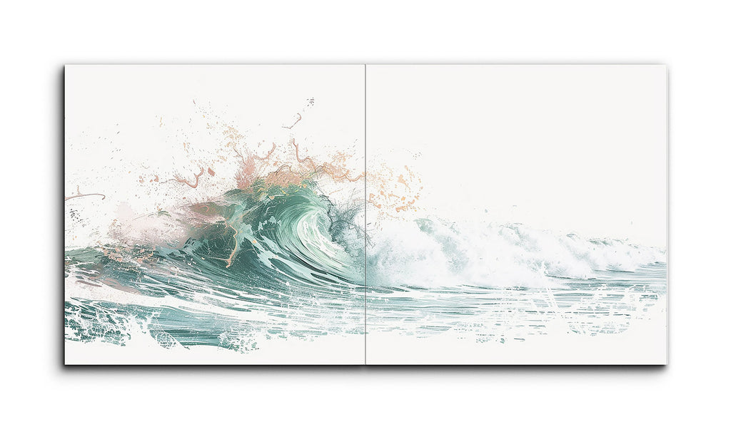 This diptych tile mural captures the essence of the ocean's power and beauty through abstract forms and a harmonious color palette. The left panel depicts the crest of a wave with dynamic brush strokes in shades of teal and green, suggesting the sea's depth and vitality. The right panel shows the wave breaking, with frothy water and spray in white and pale blue tones, creating an open composition. The seamless transition between panels conveys the wave's movement and rhythm, inviting viewers to experience the ocean's energy.