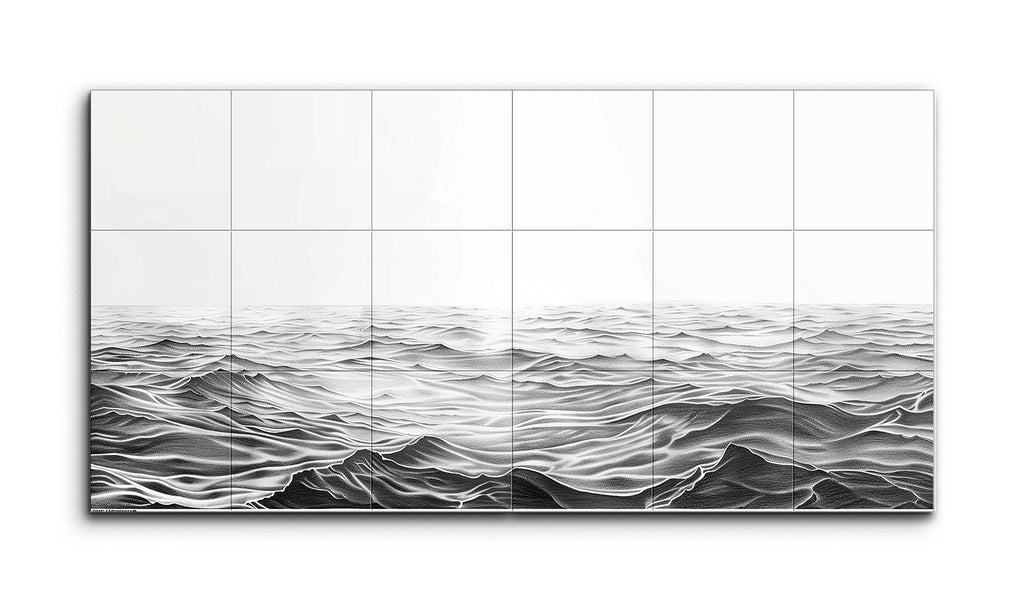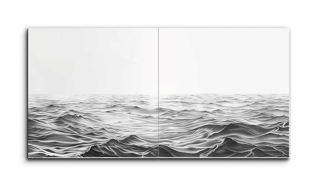 This diptych tile mural captures the essence of a monochromatic seascape, emphasizing the movement and texture of the ocean's surface. The waves are intricately detailed, showcasing patterns of light and shadow that enhance their three-dimensional quality. With a focus on form and depth, the artwork exudes a timeless and dramatic feel. The rhythmic, fluid portrayal of the water, combined with a faint horizon, conveys both the power and serenity of the sea, inviting contemplation of its beauty and complexity.