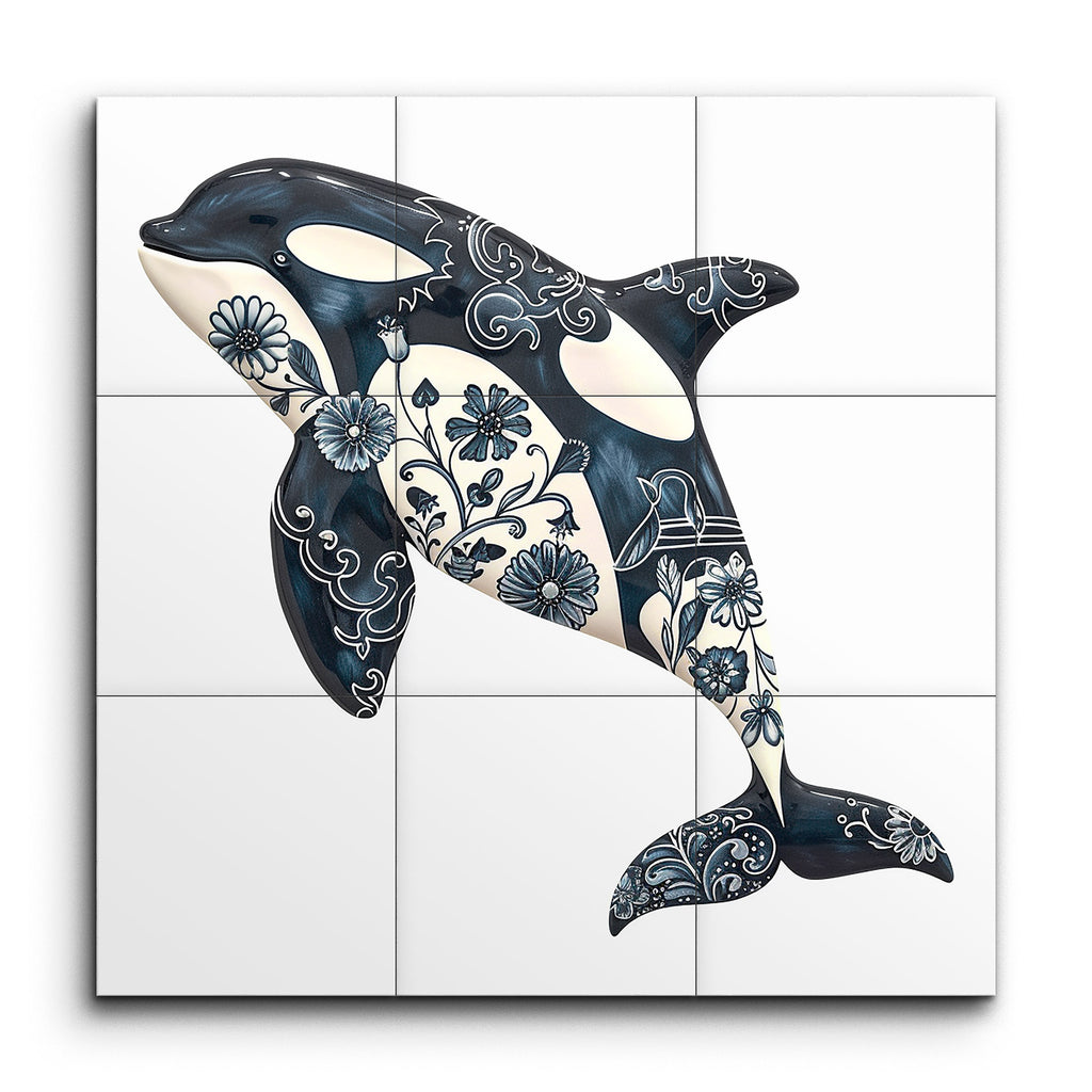 Immerse yourself in the captivating beauty of this tile mural, featuring a stylized orca adorned with intricate floral and ornamental designs. The orca's dark blue body, seamlessly integrated with delicate white floral patterns, creates a harmonious blend of nature and art. Detailed flowers, leaves, and vines grace the orca's side, dorsal fin, and tail, adding elegance and complexity. This fusion of realism and decorative art connects to nature with a fantastical, whimsical touch.