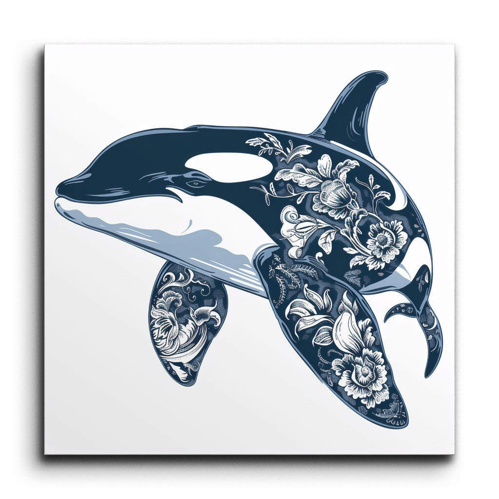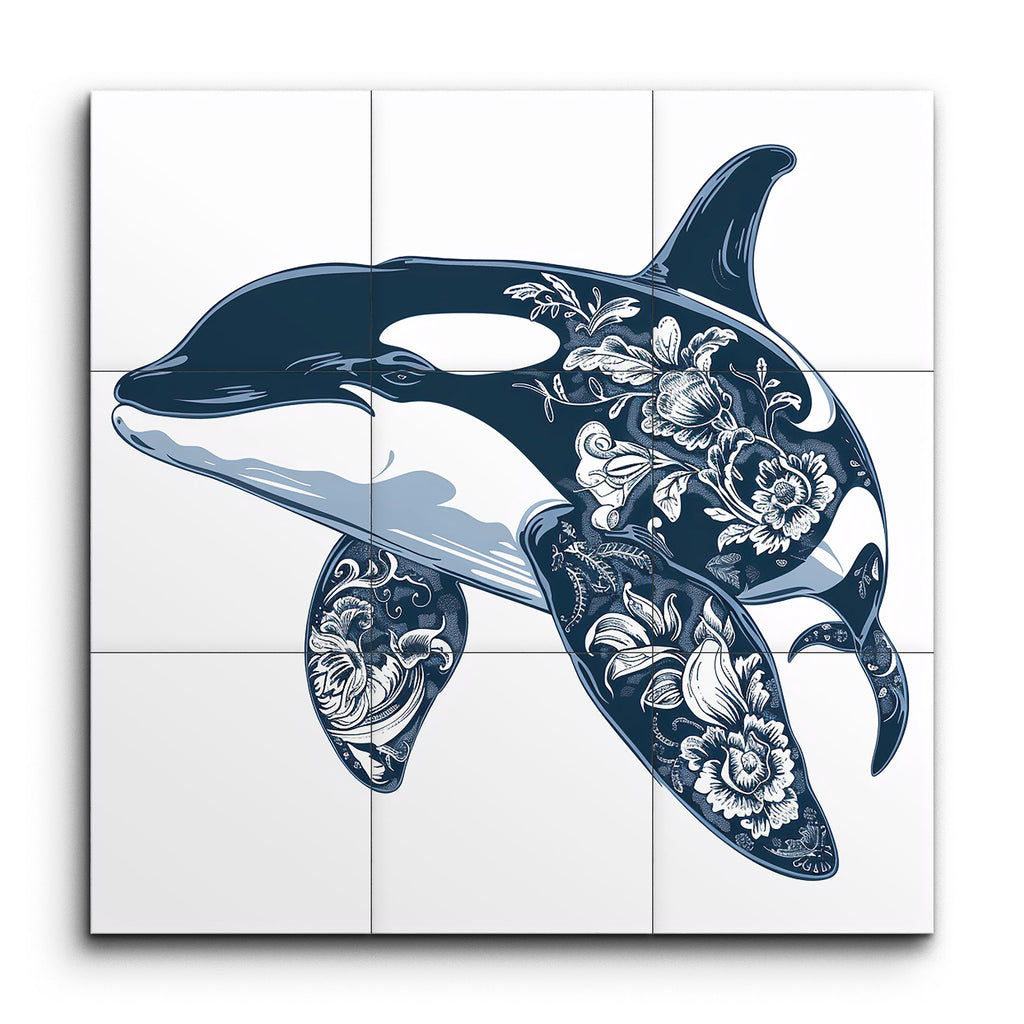 Dive into the mesmerizing world of marine elegance with our stunning tile mural featuring a stylized orca, adorned with intricate floral patterns. The orca's natural dark blue and white hues are beautifully contrasted by ornate flowers and swirling leaves, creating a harmonious blend of realism and decorative art. This captivating piece marries the majestic form of the killer whale with the delicate beauty of traditional floral designs, making it a visually striking addition to any space.